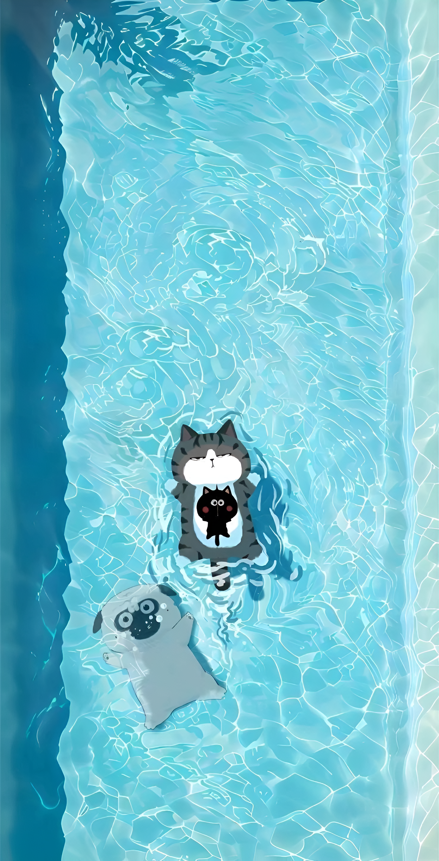 Dive into a world of fun and relaxation with this adorable wallpaper, showcasing a cat and a dog floating in a crystal-clear pool. Perfect for pet lovers and anyone seeking a lighthearted touch to their digital space.