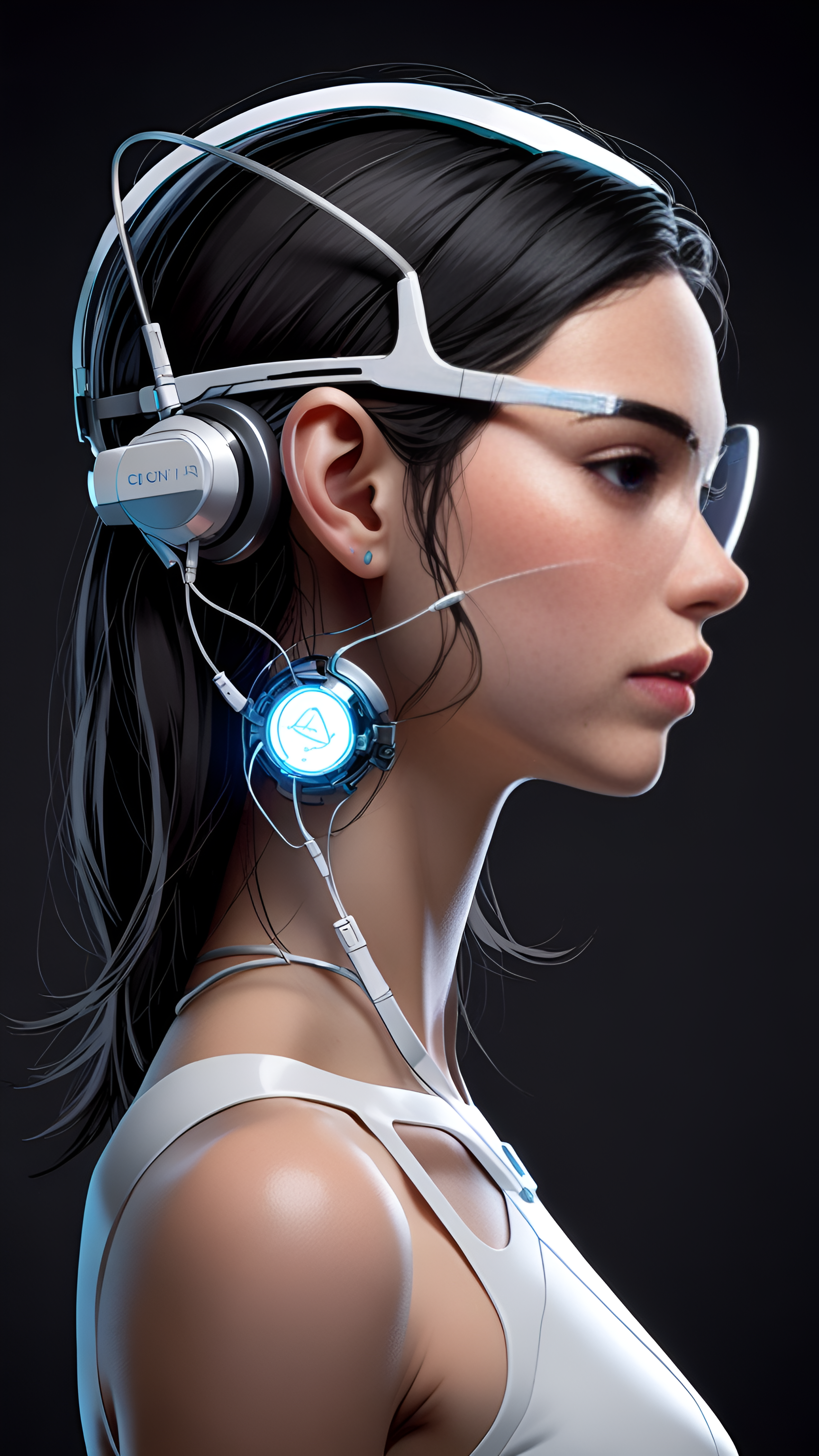 Experience the fusion of technology and humanity with this striking wallpaper, showcasing a sleek figure equipped with advanced cybernetic headphones. Perfect for tech enthusiasts and futurists.