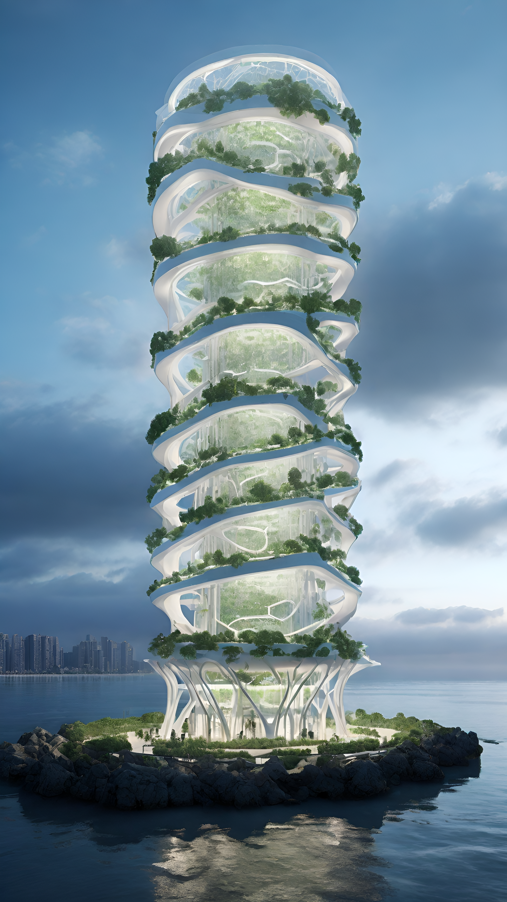 Behold the stunning spiral eco-skyscraper, a masterpiece of modern architecture that seamlessly integrates lush greenery into its design. This innovative structure features a series of cascading terraces that promote sustainability while providing breathtaking views of the surrounding water. The futuristic aesthetic is complemented by its eco-friendly elements, making it a symbol of harmony between nature and urban living.