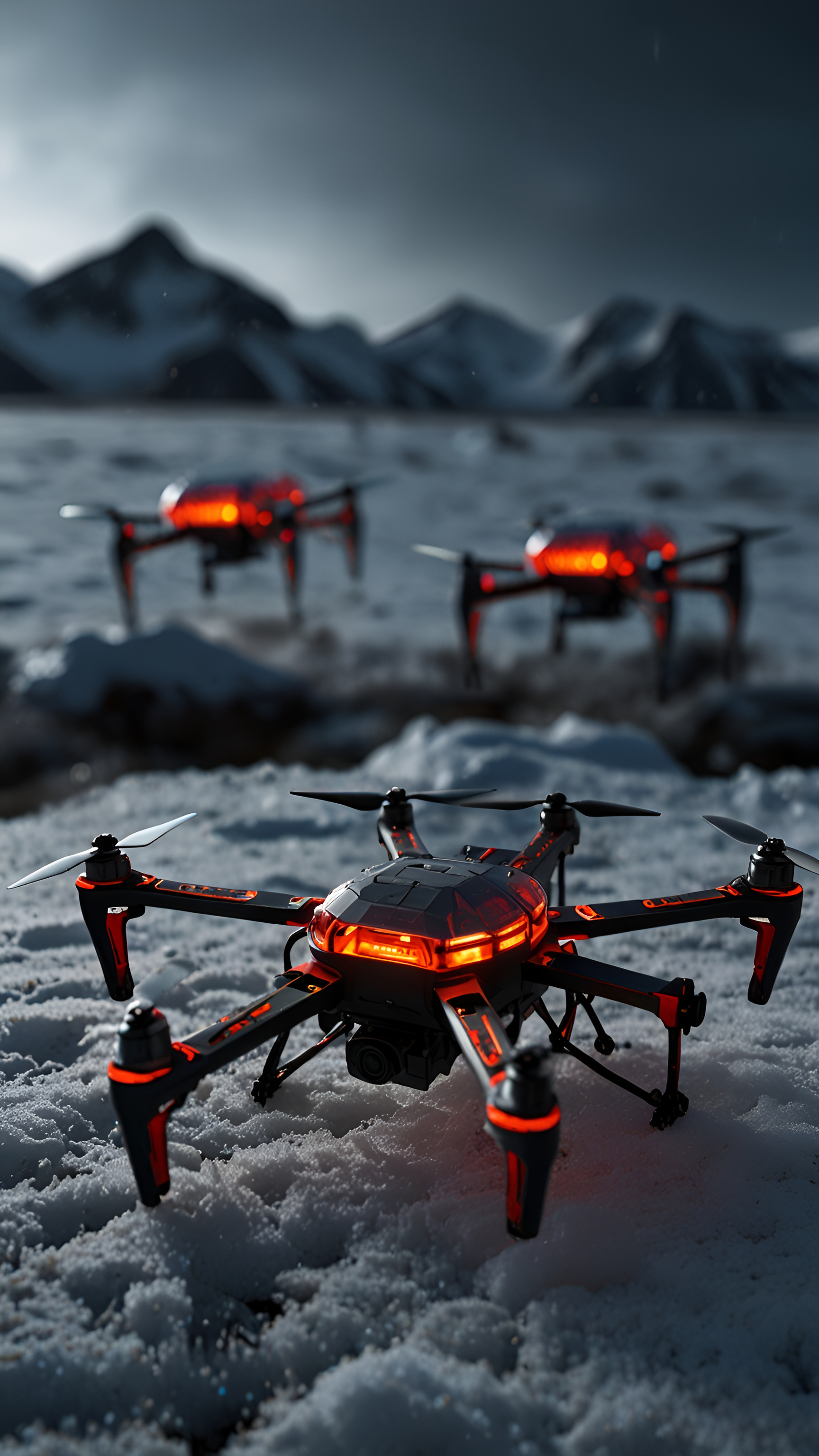 Explore the striking imagery of advanced drones with glowing red lights, set against a stark snowy backdrop. This captivating scene showcases the fusion of technology and nature, highlighting the drones' sleek design and their capabilities in extreme environments.