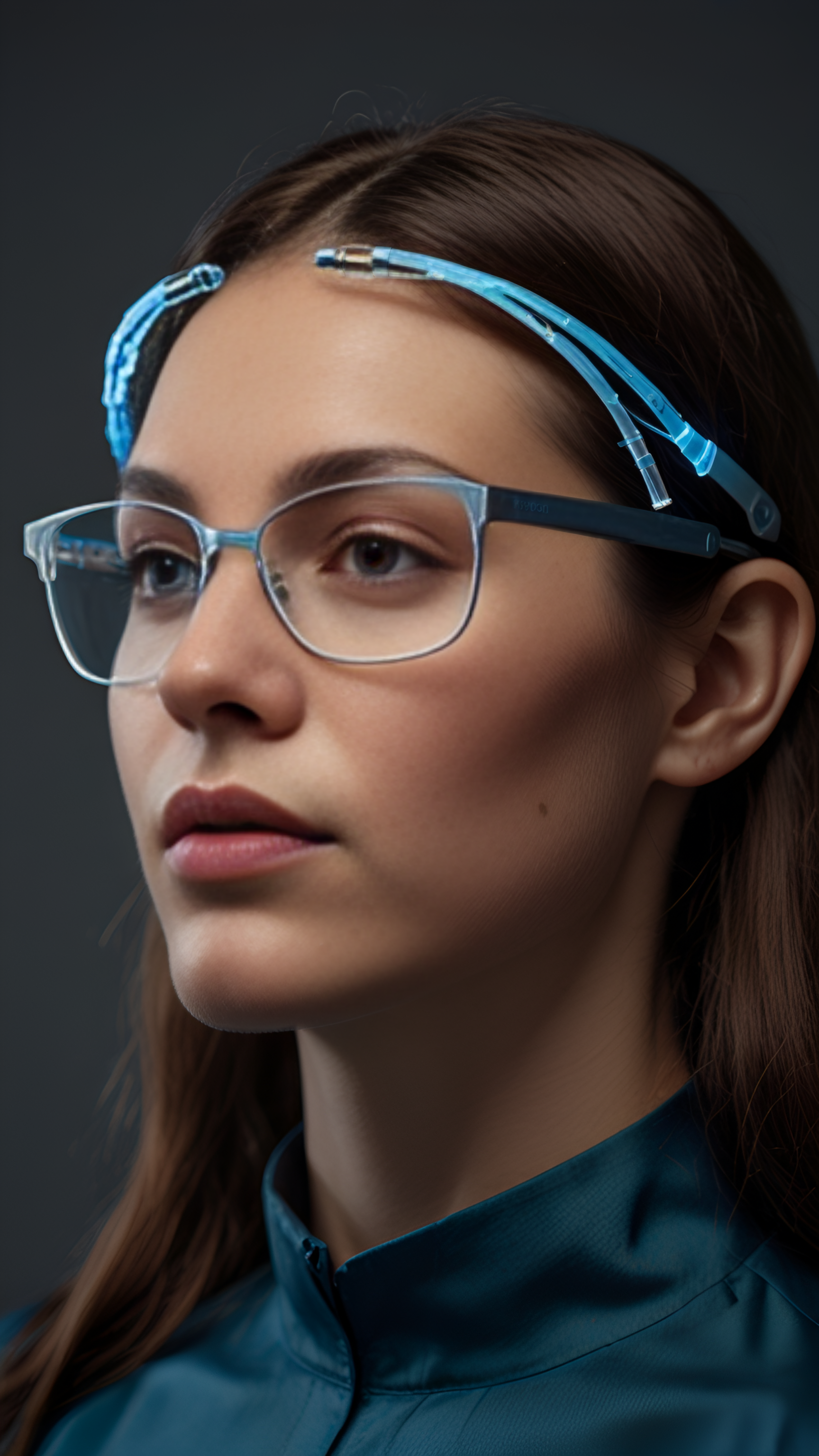 Explore the cutting-edge world of fashion with this striking image of a model wearing high-tech glasses and a sleek tech-inspired outfit. The minimalist background highlights the innovative design, embodying a perfect blend of style and technology.