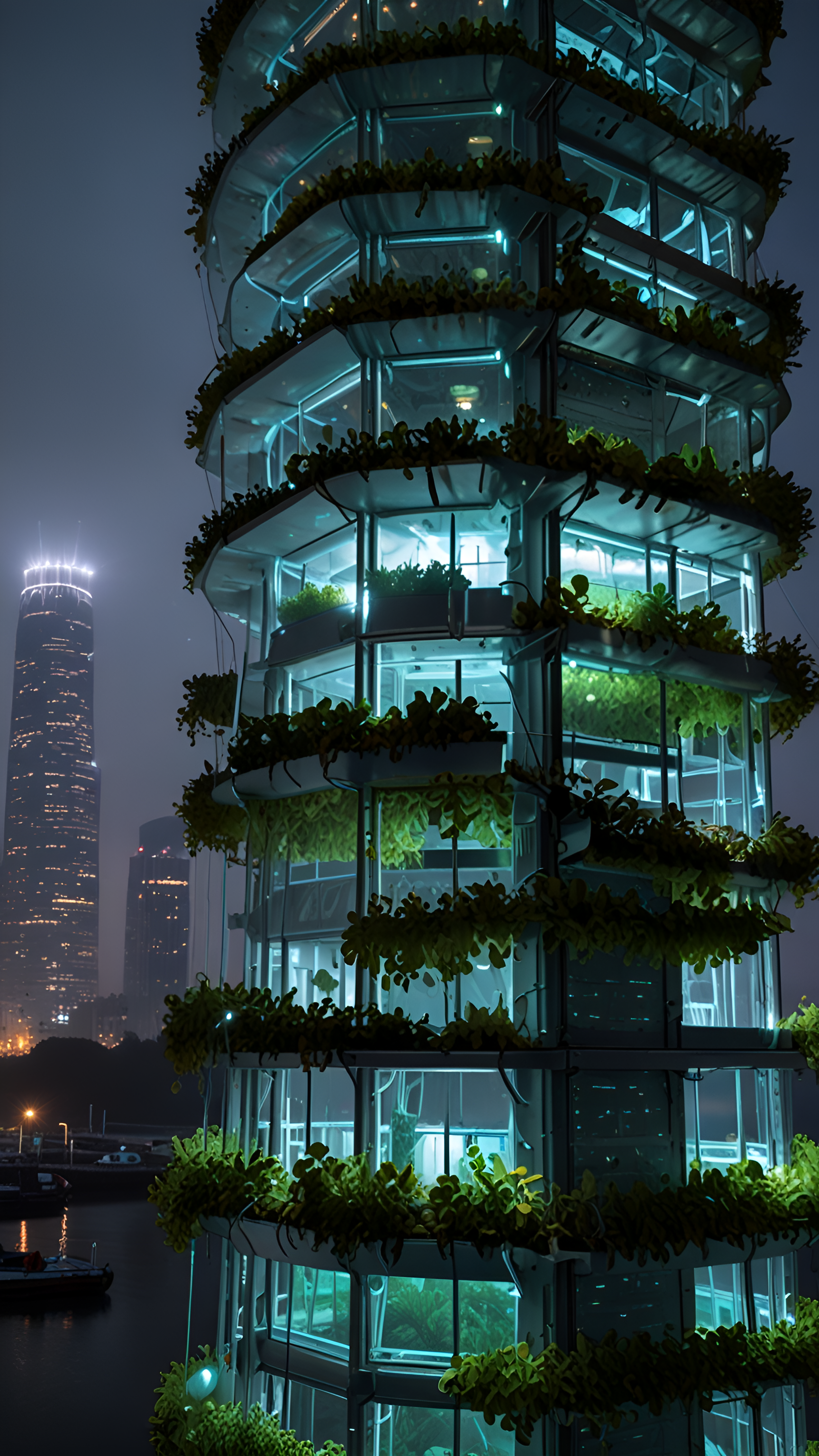 Witness the beauty of a futuristic vertical garden tower, glowing softly against the night skyline. This unique structure showcases sustainable design with lush greenery cascading from its balconies, harmonizing nature and modern architecture in an urban setting.