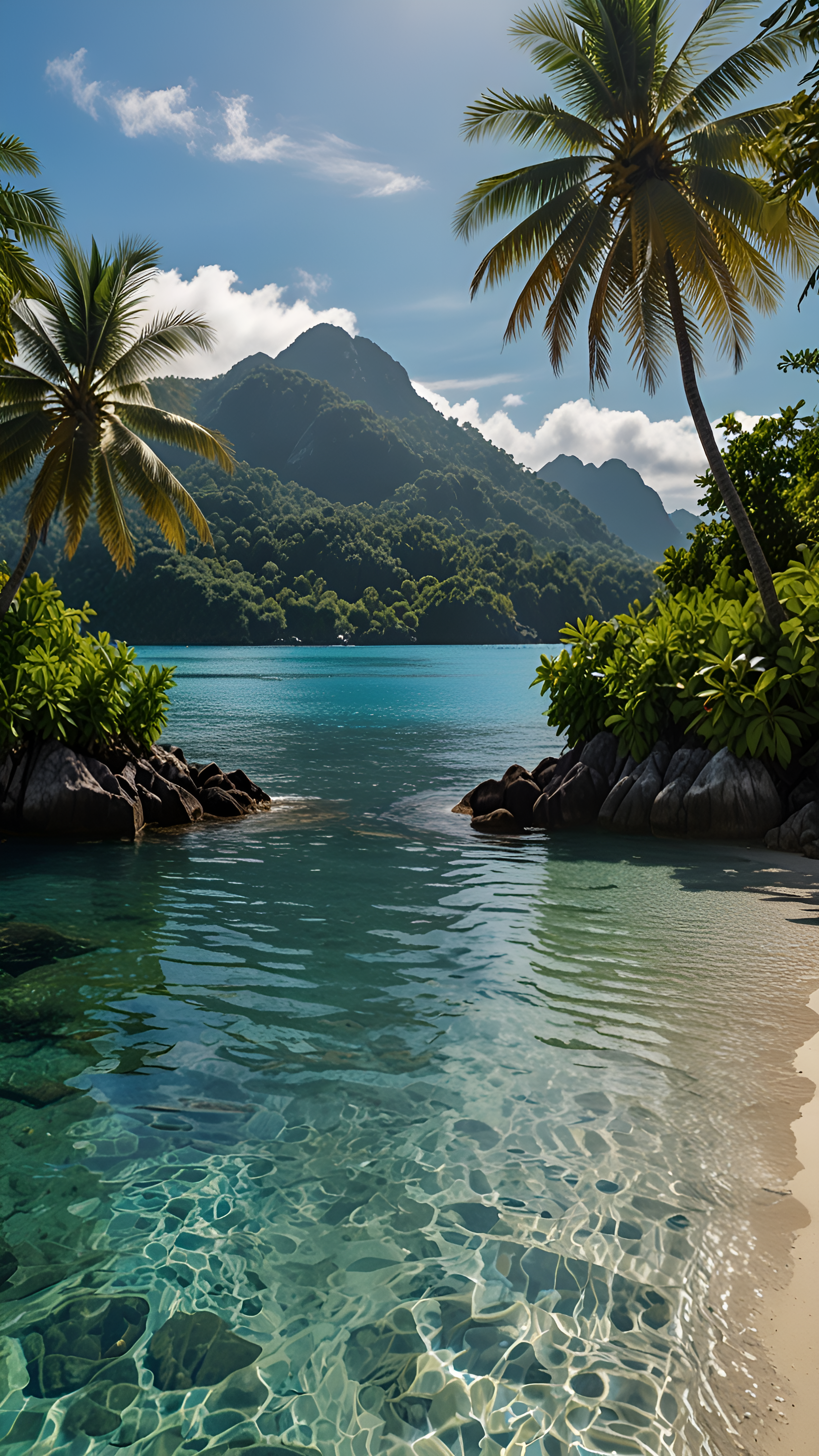 Discover the beauty of 'Tropical Paradise: Tranquil Waters,' where the serene waters meet lush tropical landscapes. This stunning wallpaper showcases a crystal-clear lagoon surrounded by vibrant palm trees and majestic mountains in the background. The sunlight dances on the water's surface, creating a mesmerizing reflection that invites you to escape into this idyllic paradise. Perfect for those who dream of sandy beaches and peaceful retreats, this image captures the essence of relaxation and natural beauty.