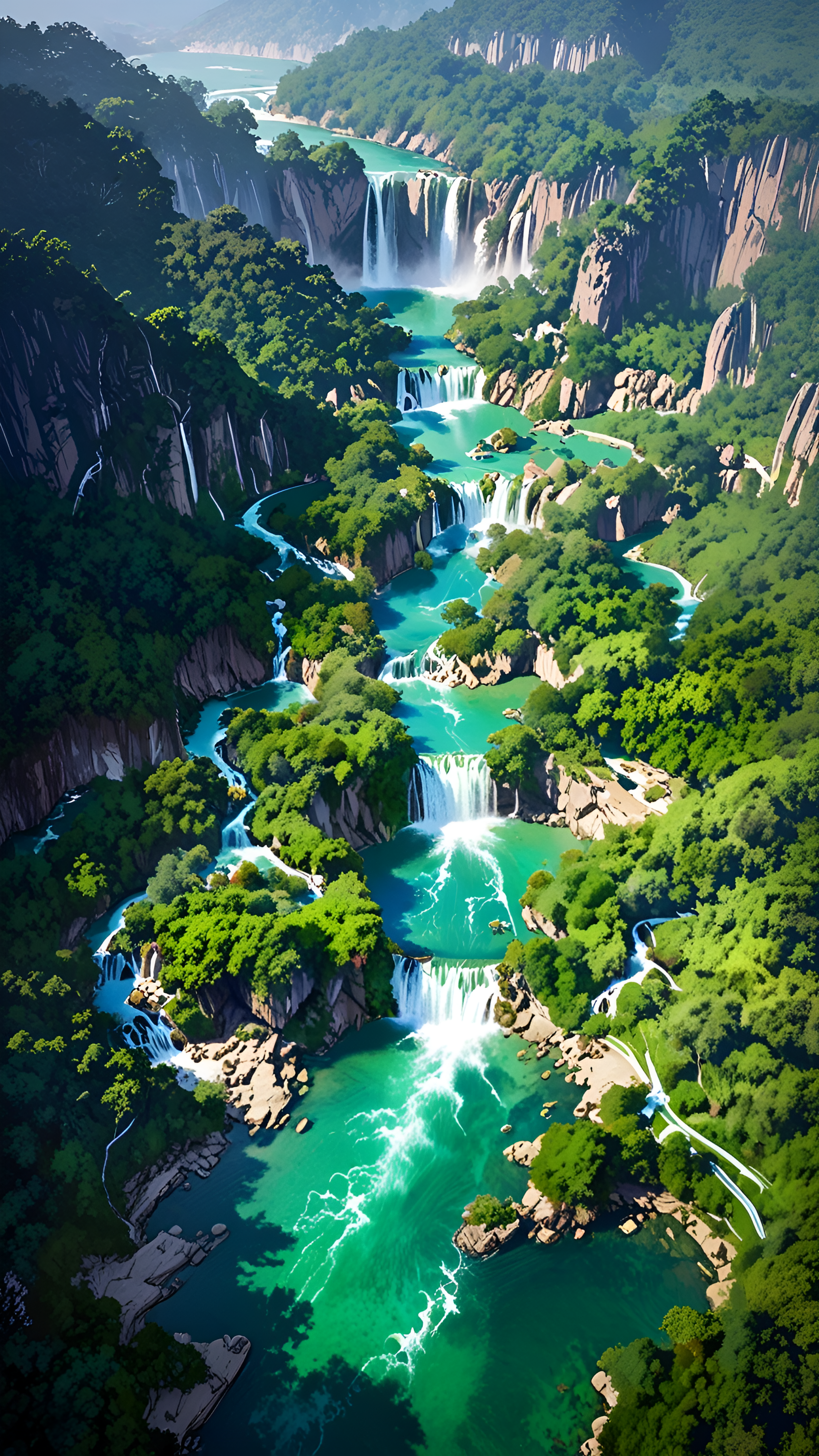 Experience the breathtaking beauty of 'Cascade Dreams: The Enchanted Waterfalls.' This mesmerizing wallpaper captures a stunning aerial view of cascading waterfalls flowing through a vibrant landscape of lush greenery and turquoise waters. The interplay of light and shadow creates a magical atmosphere, inviting viewers to immerse themselves in this serene natural paradise. Ideal for nature lovers and those seeking inspiration from the beauty of the great outdoors, this image embodies tranquility and wonder.