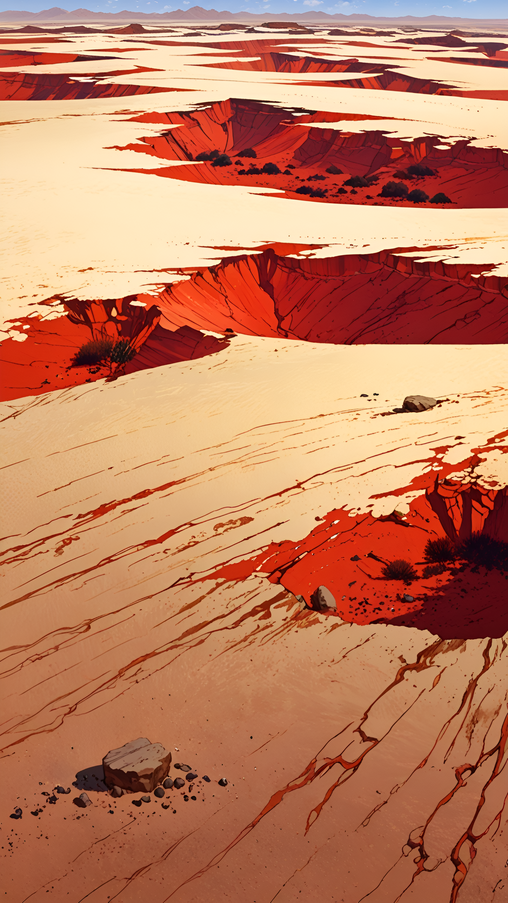 Explore the breathtaking beauty of 'Crimson Canyons: The Desert's Heart.' This stunning wallpaper showcases a vast desert landscape characterized by deep red canyons and stark sandy plains. The vibrant red hues of the canyon walls contrast dramatically with the pale sand and scattered rocks, creating a striking visual impact. The intricate textures and patterns etched into the earth tell a story of time and nature's relentless forces, inviting viewers to experience the raw beauty and solitude of this unique environment.