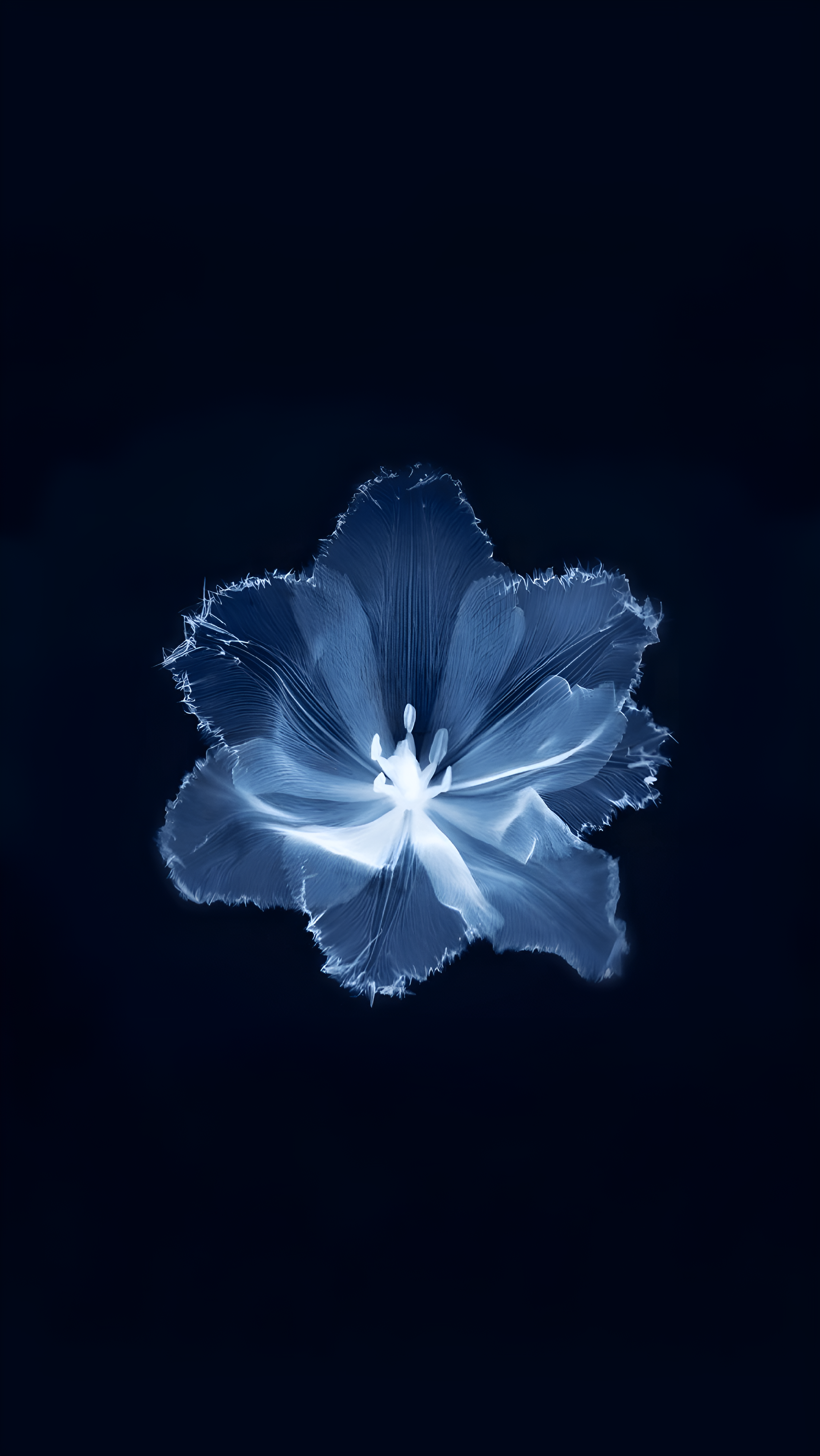 Discover the enchanting beauty of 'Ethereal Bloom: The Dance of Light,' a stunning wallpaper that captures the delicate essence of a flower illuminated by soft, ethereal light. Against a deep navy background, the translucent petals create a mesmerizing visual effect, evoking a sense of tranquility and grace. This artwork invites viewers to appreciate the intricate details and the serene atmosphere it embodies, making it a perfect choice for those who cherish the elegance of nature and artistic expression.