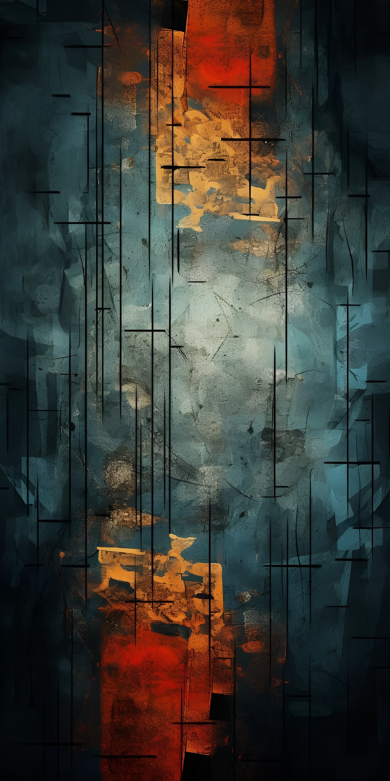 Dive into 'Fragments of Emotion: A Bold Abstract,' an intriguing wallpaper that captures the essence of modern artistry. This piece features a dynamic interplay of deep blues, fiery reds, and warm golden hues, layered with bold black lines that create a sense of structure amidst chaos. The contrasting colors and geometric forms invite viewers to explore the depths of emotion and creativity, making it a perfect addition to any contemporary space. Ideal for art enthusiasts and those who appreciate the beauty of abstract expression.