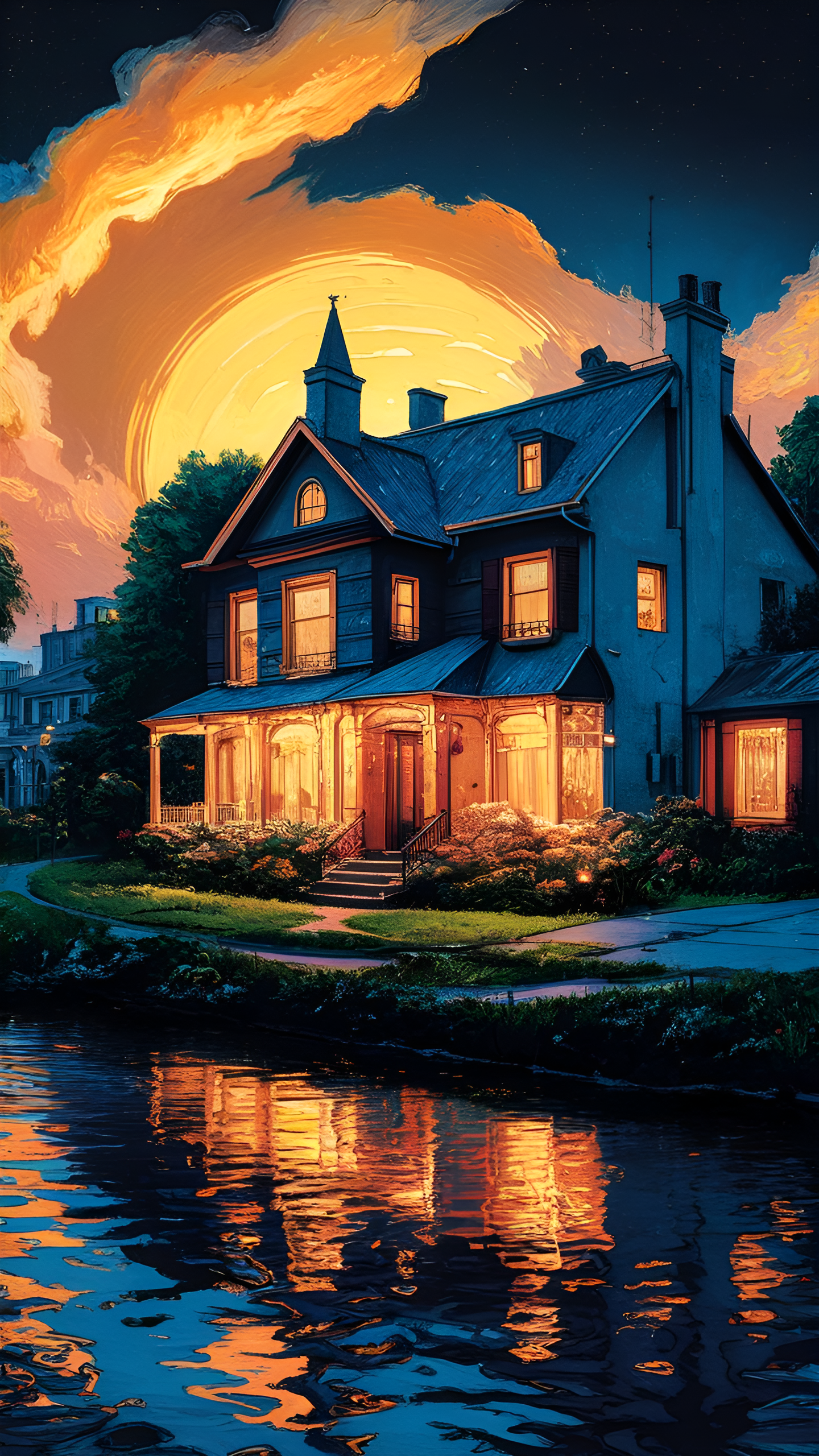 Discover 'Golden Glow: The Enchanted Evening,' a captivating wallpaper that showcases a beautifully illuminated house reflecting in a serene body of water. The warm glow from the windows contrasts with the deep blues of the night sky, while a majestic sunset casts a golden hue over the scene. This artwork evokes a sense of warmth, nostalgia, and tranquility, making it a perfect backdrop for those who appreciate the beauty of cozy evenings and picturesque landscapes.