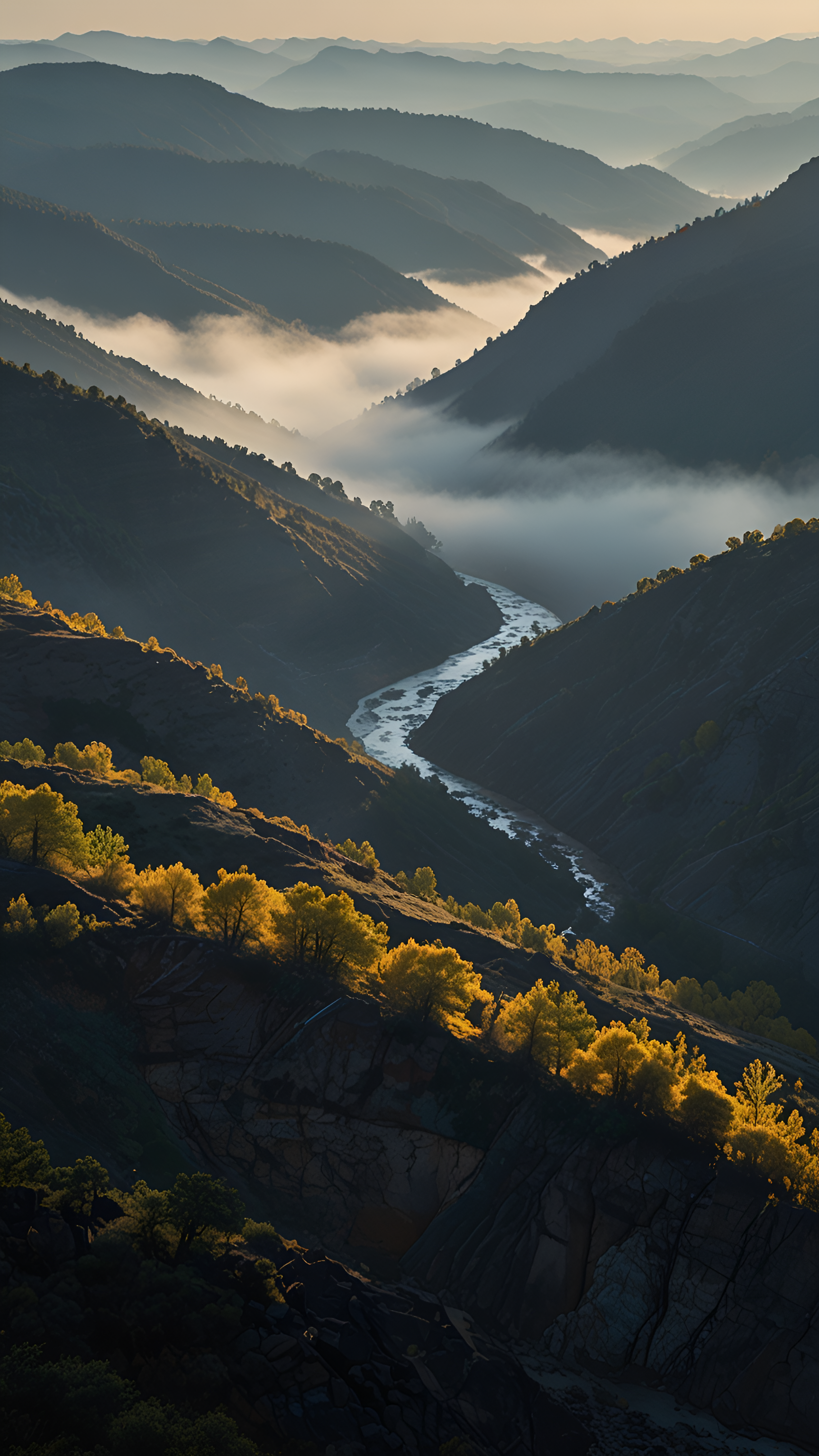 Immerse yourself in the breathtaking beauty of 'Mountain Serenity: The Whispering River,' a stunning landscape wallpaper that captures the tranquil essence of nature. This artwork features a meandering river flowing through majestic mountains, shrouded in soft mist and illuminated by the warm glow of golden autumn foliage. The layered hills create a sense of depth, inviting viewers to explore the serene wilderness and experience the calming embrace of nature. Ideal for those who appreciate the peaceful allure of natural landscapes.