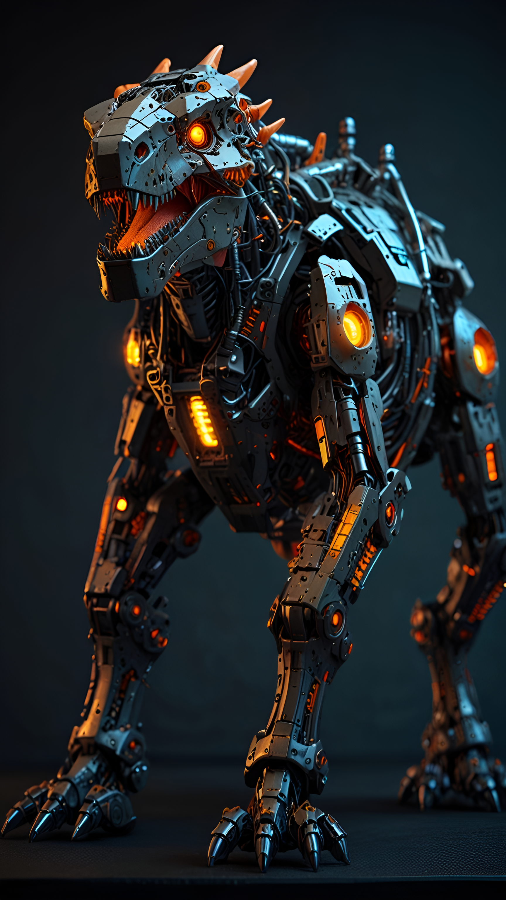 Introducing 'Cyber Rex: The Mechanical Predator,' a stunning wallpaper that brings the ferocity of a dinosaur into the realm of futuristic technology. This striking design features a robotic T-Rex, intricately crafted with metallic textures, glowing orange accents, and sharp, menacing features. The combination of mechanical elements and fierce aesthetics creates a powerful visual statement, perfect for fans of science fiction and robotics. This wallpaper is ideal for those who appreciate the fusion of nature and technology, and want to showcase their love for innovative design in their digital space.