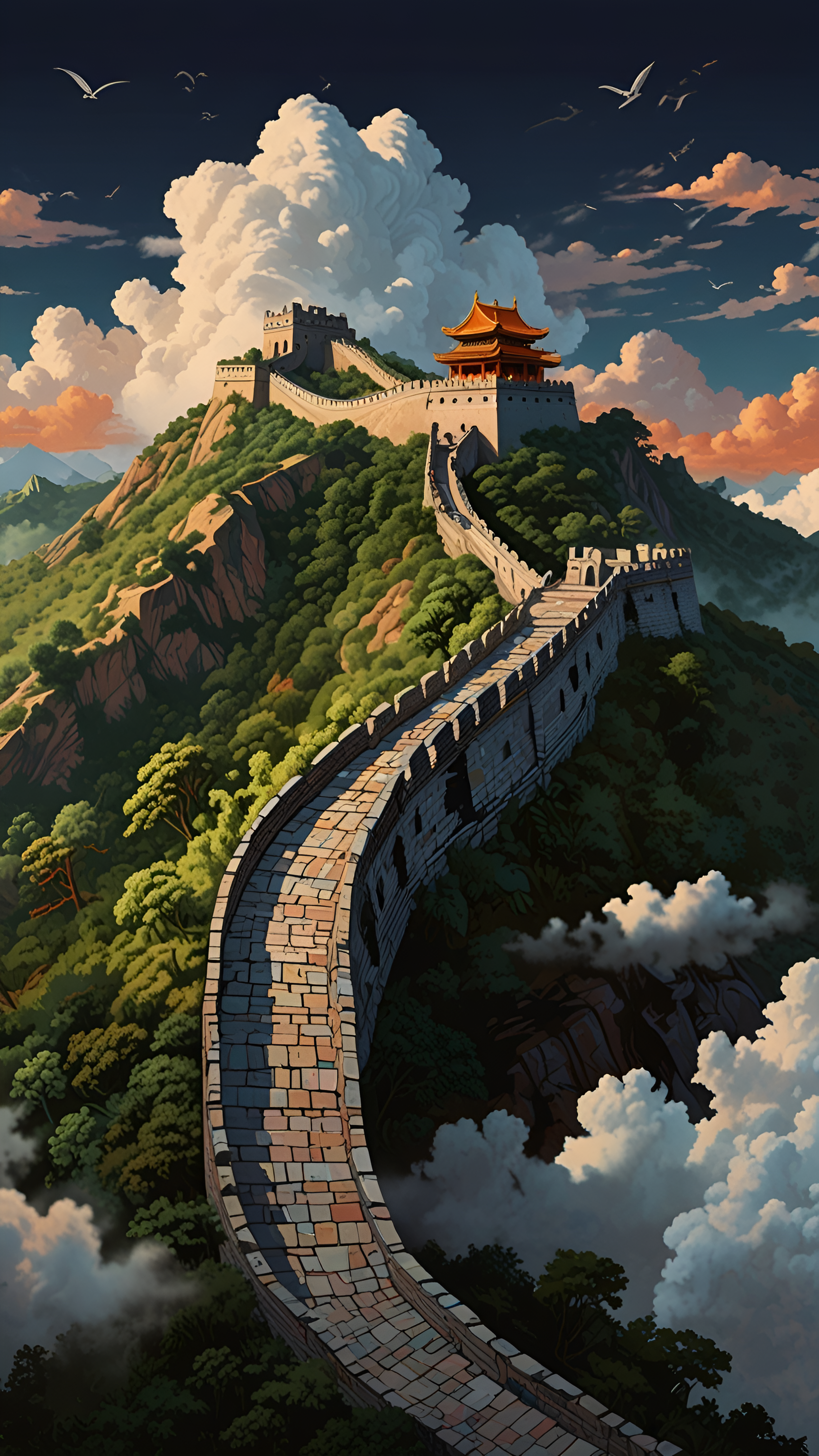 Introducing 'Great Wall Majesty: A Journey Through Time,' an enchanting wallpaper that captures the awe-inspiring beauty of the Great Wall of China. This artwork features the wall winding across lush green mountains, highlighted by a magnificent traditional pagoda with vibrant orange rooftops. The dramatic clouds and soaring birds add to the sense of grandeur and tranquility, inviting viewers to immerse themselves in the rich history and natural beauty of this iconic landmark. Perfect for history enthusiasts and nature lovers alike, this wallpaper will enhance any digital space with its captivating scenery.