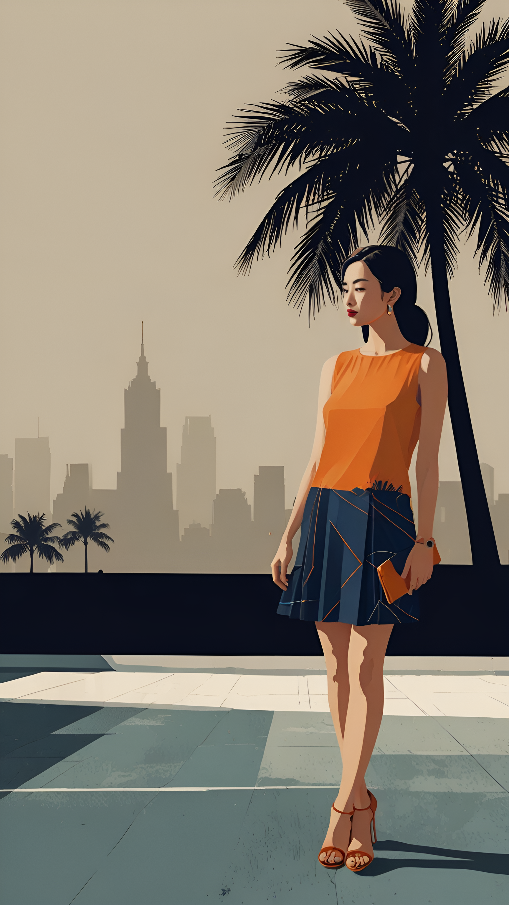 Introducing 'Urban Elegance: A Fashion Statement,' a striking wallpaper that showcases a fashionable woman standing confidently against a city skyline. Dressed in a vibrant orange top and a chic skirt, she embodies modern style and sophistication. The silhouette of skyscrapers in the background, coupled with the palm trees framing the scene, creates a perfect blend of urban life and tropical vibes. This artwork is ideal for fashion enthusiasts and city lovers, adding a touch of elegance and contemporary flair to any digital space.