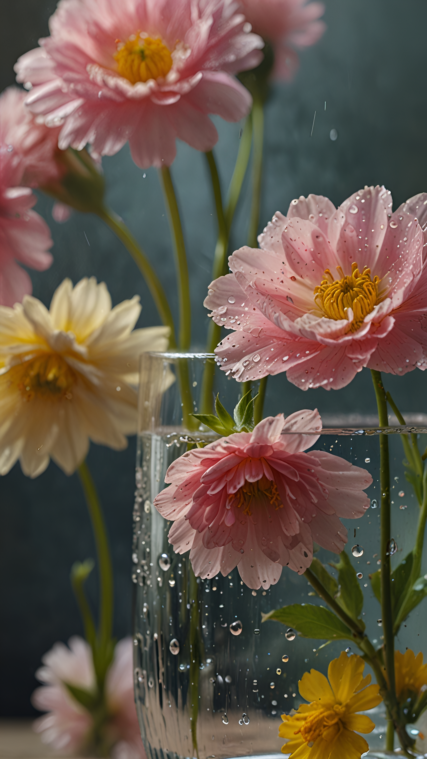 Introducing 'Floral Serenity: A Splash of Color,' a stunning wallpaper that captures the delicate beauty of pink and yellow flowers elegantly arranged in a glass vase. The droplets of water on the petals and the glass create a refreshing ambiance, evoking a sense of tranquility and natural beauty. The soft focus background enhances the vibrant colors of the flowers, making this artwork a perfect choice for those who appreciate the elegance of nature. Ideal for adding a touch of freshness and warmth to any digital space.