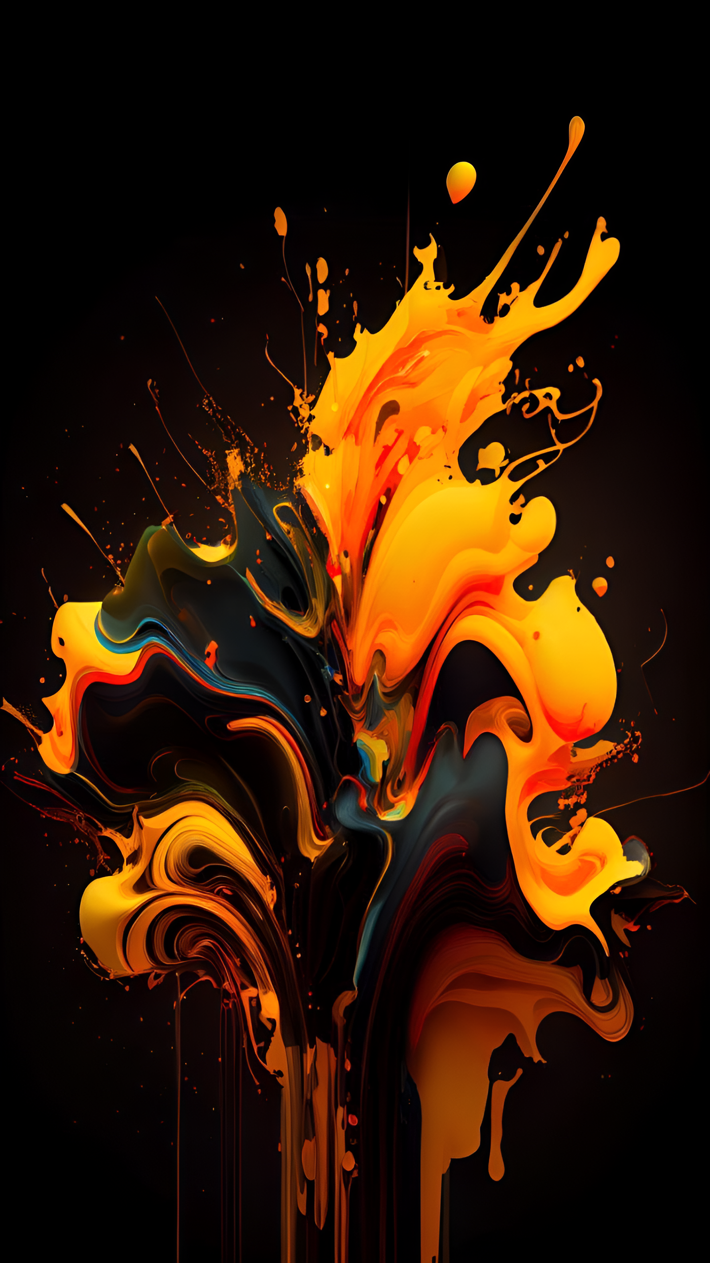 Presenting 'Inferno Flow: The Vibrant Eruption,' an electrifying wallpaper that captures the essence of dynamic movement and color. This artwork showcases a breathtaking explosion of fiery orange and deep black, with swirling patterns and splashes that evoke a sense of energy and passion. The fluidity of the paint creates an immersive experience, drawing the viewer into a world of abstract expression. Perfect for those who appreciate bold artistry and want to add a striking visual element to their space.