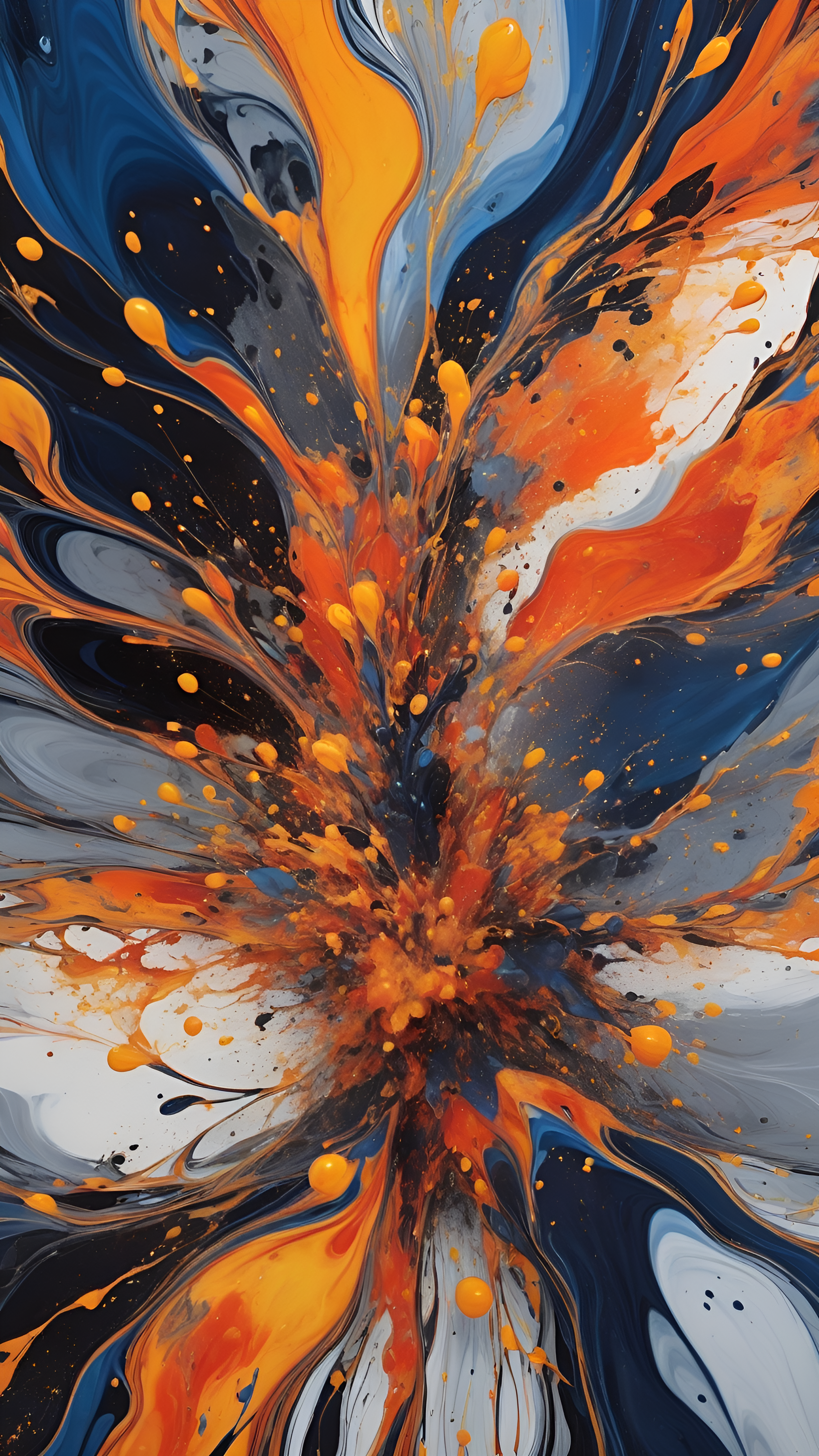 Presenting 'Eruption of Colors: The Abstract Explosion,' a captivating wallpaper that captures the essence of creativity and energy through a stunning display of swirling colors. This artwork features a dramatic explosion of vibrant orange and deep blue hues, blending seamlessly with splashes of gray and black. The dynamic movement and fluidity of the paint create a sense of motion and excitement, making it a perfect focal point for any space. Ideal for art lovers and those who appreciate bold, expressive designs that evoke emotion and inspire imagination.