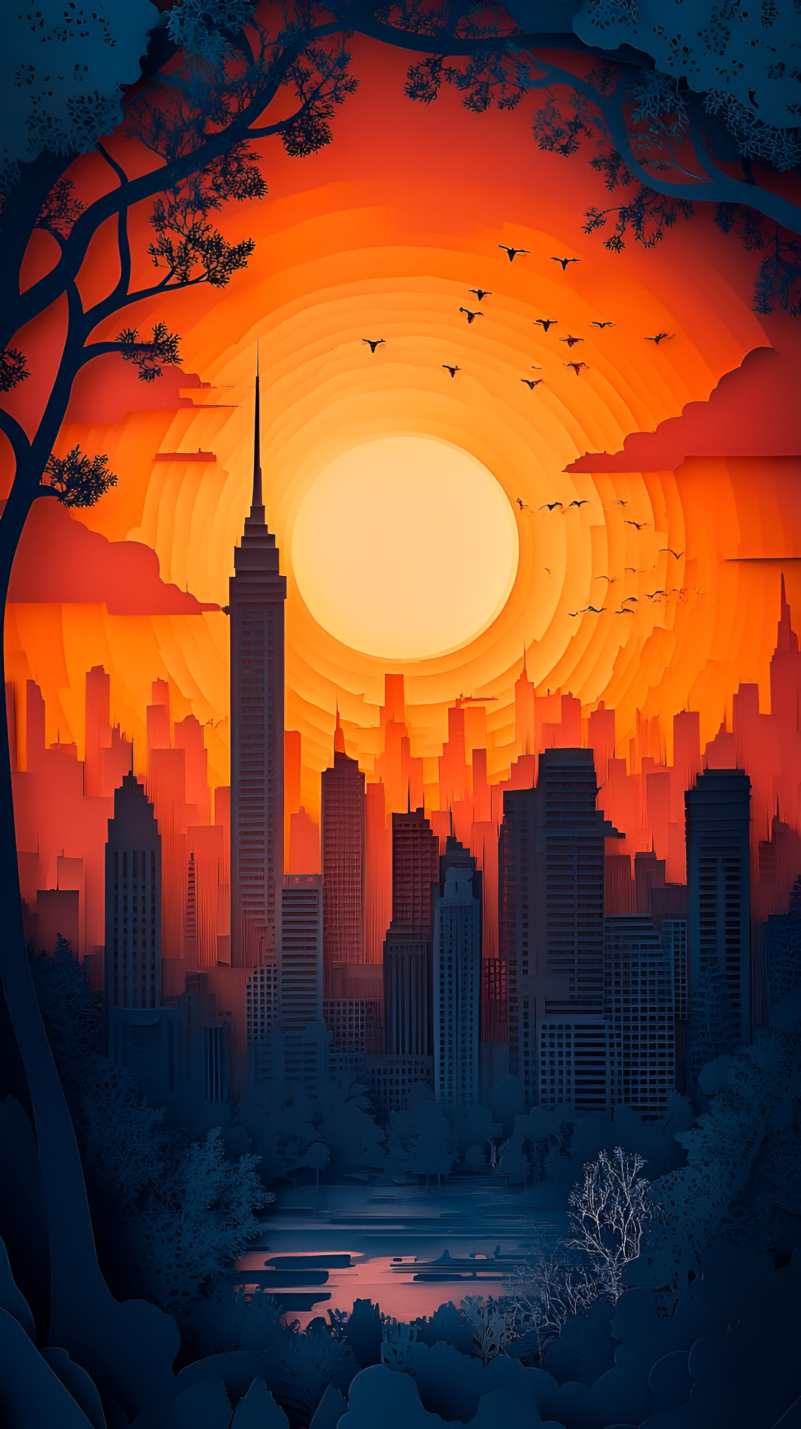 Immerse yourself in 'Urban Sunset: A City in Glow,' a captivating wallpaper that captures the vibrant energy of a city skyline at sunset. This artwork features the iconic silhouette of skyscrapers, with the Empire State Building standing tall against a backdrop of a radiant orange and red sky. The sun casts a warm glow over the city, while birds soar in the distance, adding a sense of freedom and movement. Perfect for city lovers and dreamers, this piece evokes the beauty of urban life and the serenity of nature.