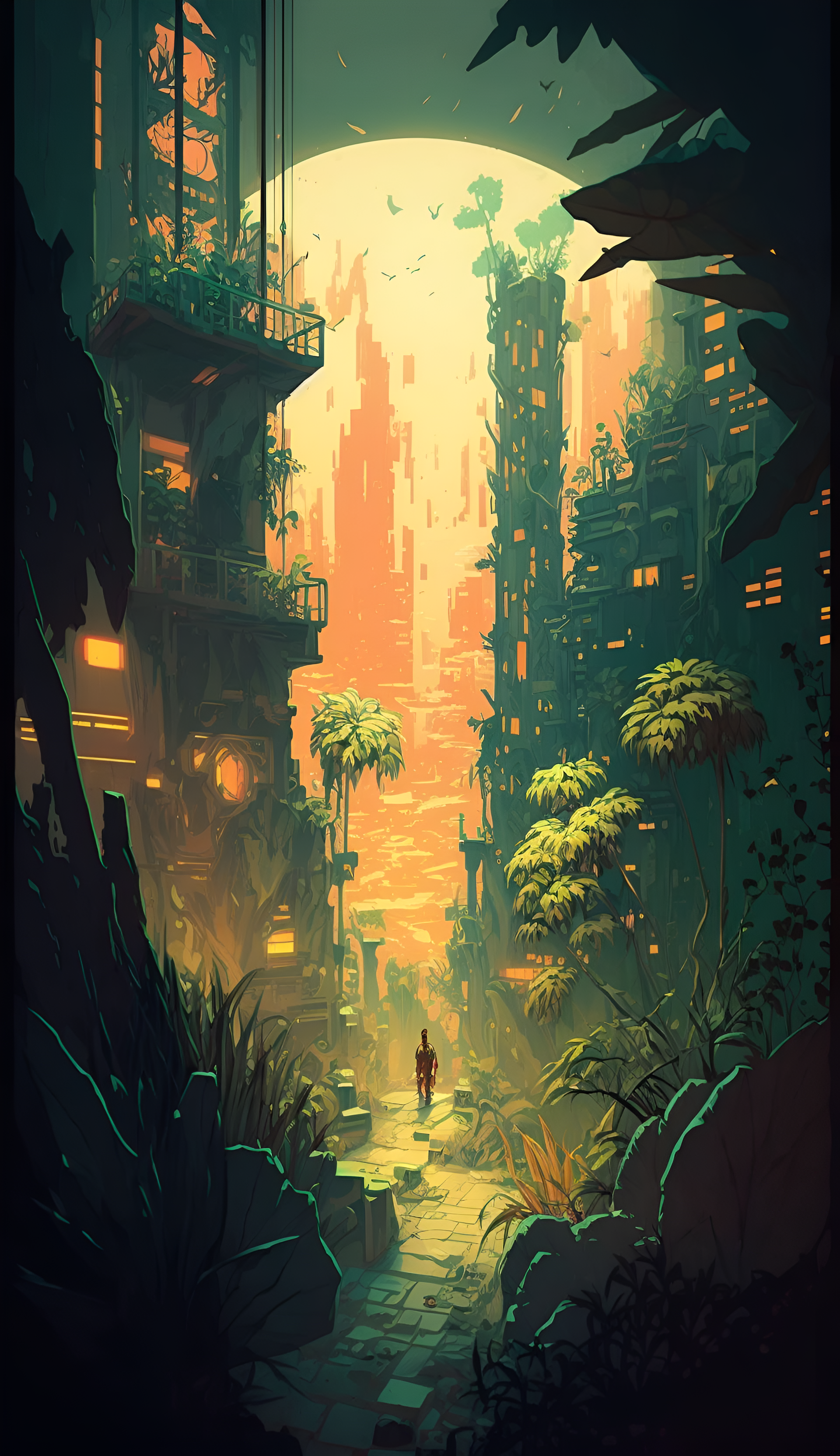 Explore the enchanting world of 'Urban Rebirth: The Nature Within,' a stunning wallpaper that captures a post-apocalyptic city where nature has reclaimed its territory. The vibrant colors of the setting sun illuminate the towering remnants of urban architecture, now intertwined with lush greenery and palm trees. A solitary figure walks down a winding path, surrounded by the remnants of a once-bustling metropolis, evoking a sense of solitude and exploration. This artwork beautifully blends the themes of nature and technology, inviting viewers to imagine a future where harmony reigns.