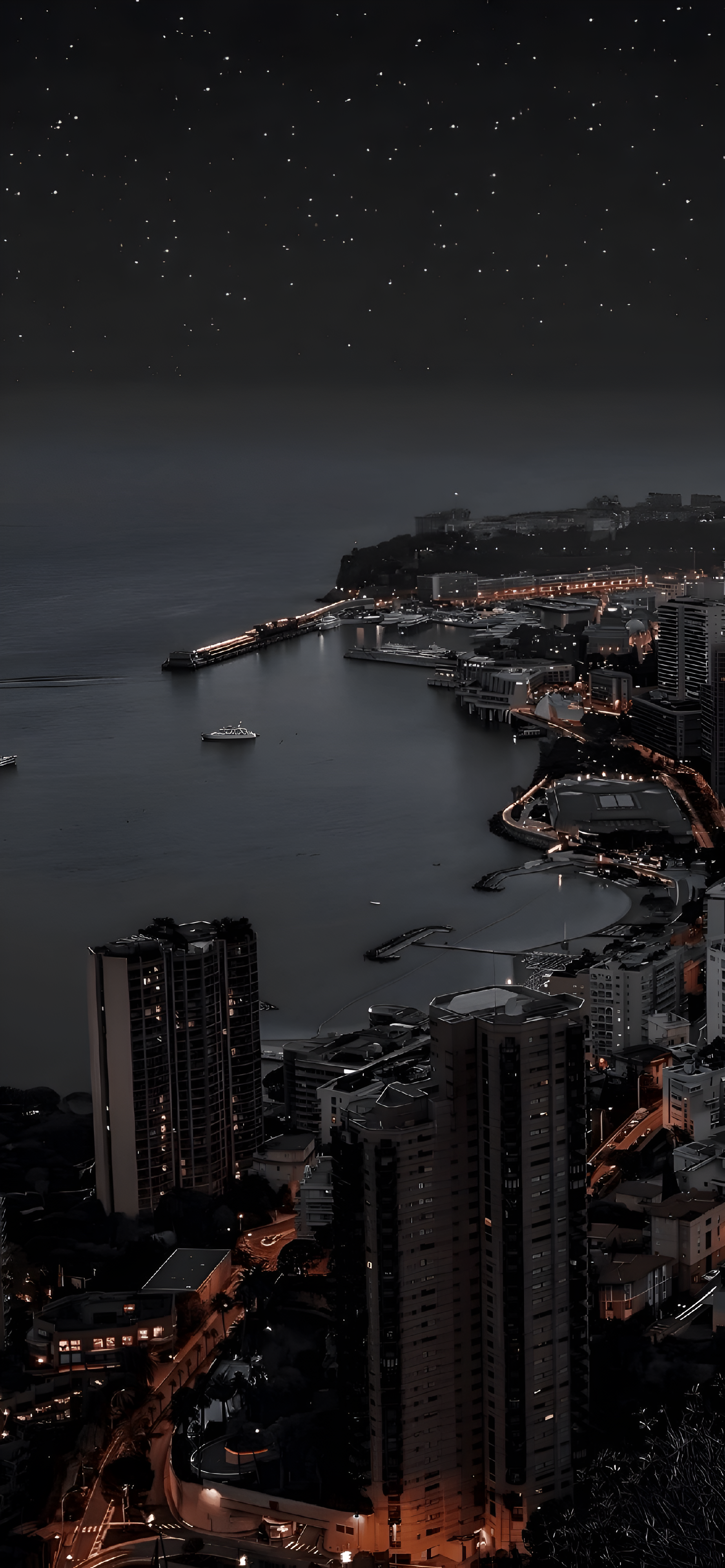 A captivating nighttime cityscape overlooking a calm bay dotted with lights. This wallpaper brings a serene, sophisticated urban vibe to your screen with its gentle glow and peaceful scenery.