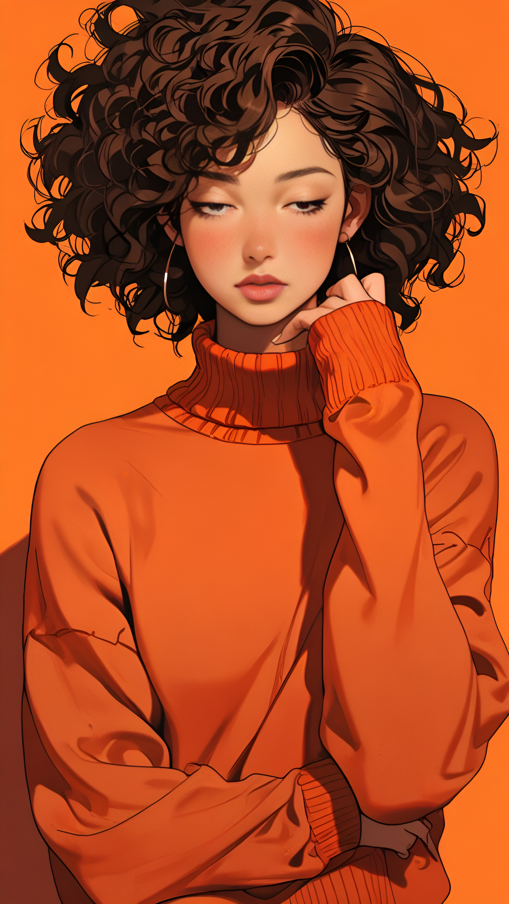 Warmth and contemplation emanate from this illustration. A beautiful woman with curly hair poses against an orange background, creating a modern, aesthetic digital artwork. Perfect for adding a touch of artistic flair.
