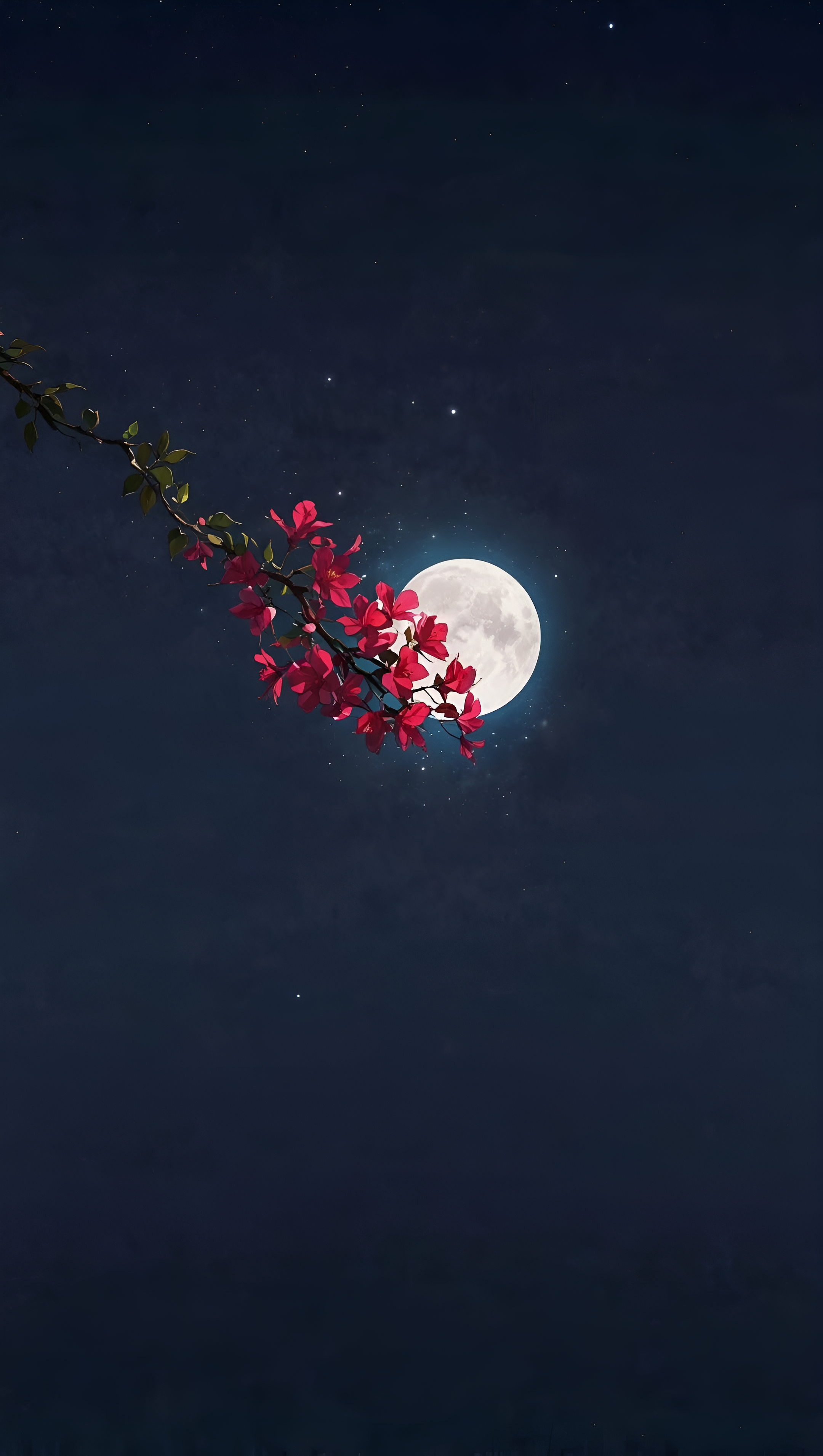A serene night sky wallpaper featuring a radiant full moon peeking behind a blooming branch of vibrant red flowers. Embrace the tranquility and beauty of the night with this stunning image.