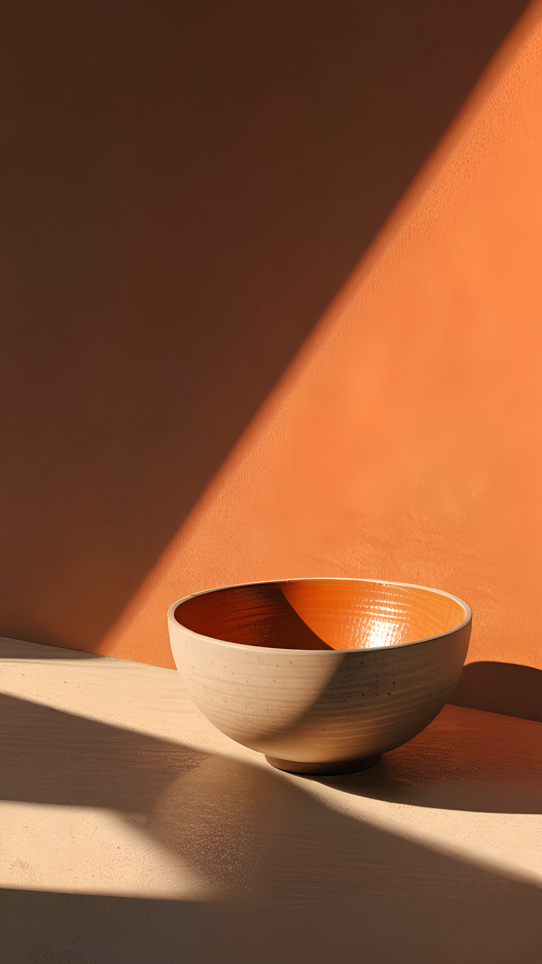 A modern minimalist wallpaper featuring a ceramic bowl bathed in warm, inviting sunlight. The interplay of light and shadow creates a serene and calming ambiance, perfect for any digital device.