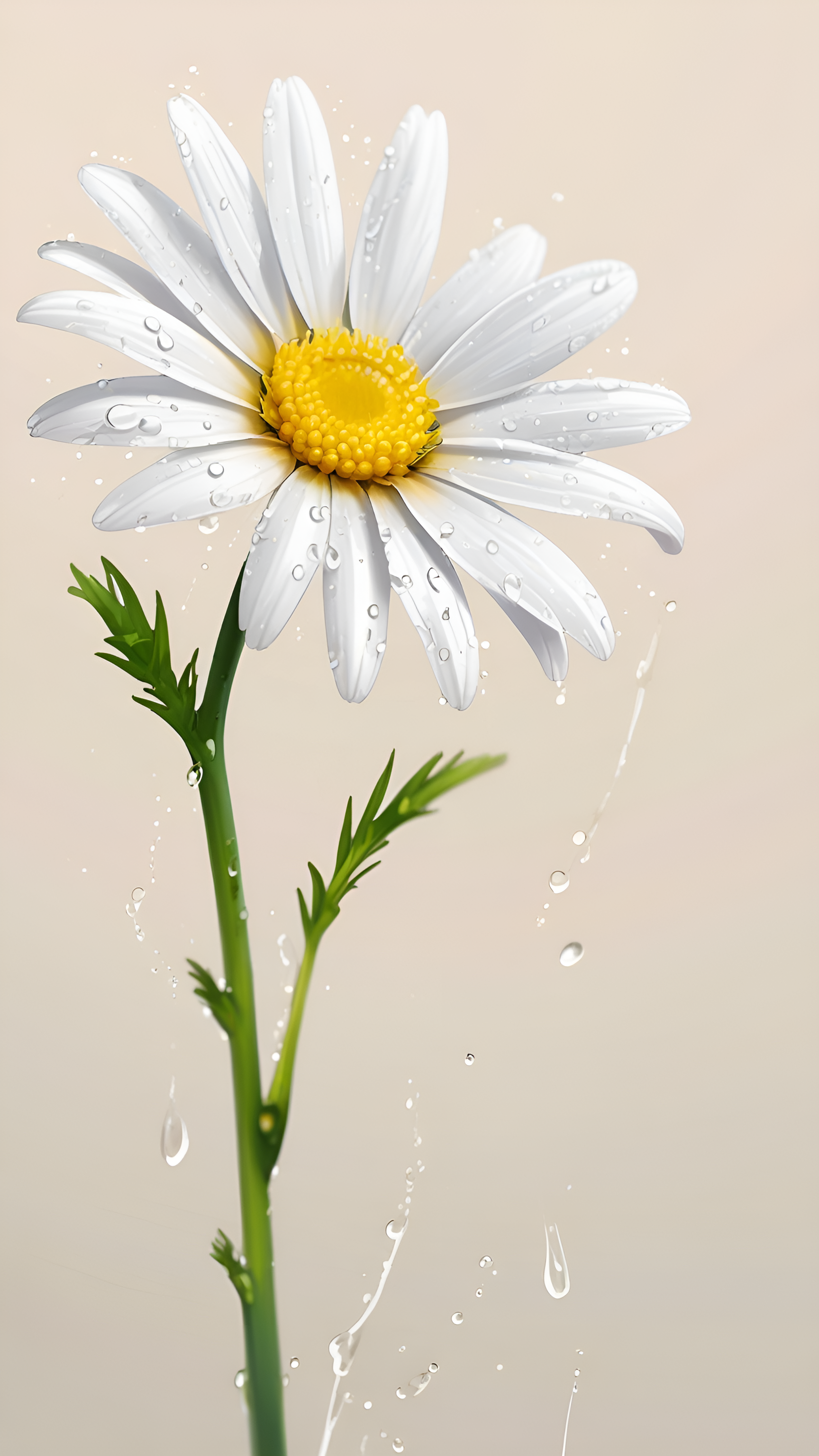 Capture the freshness of spring with this serene daisy wallpaper. Delicate water droplets adorn the white petals and lush green stem against a gentle background. Perfect for adding a touch of nature to your screen.