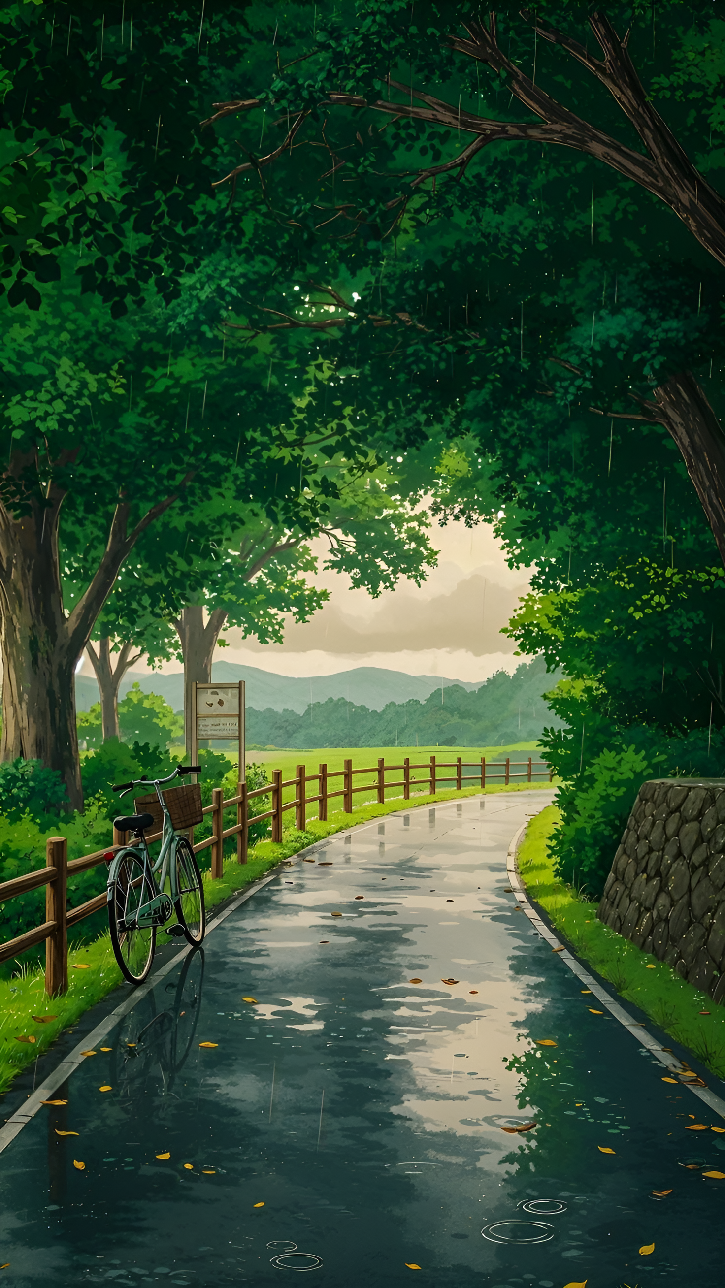 Get lost in the calm beauty of a rainy country road. A vintage bicycle rests beside a wooden fence, as gentle rain kisses the asphalt and brings life to the green landscape.