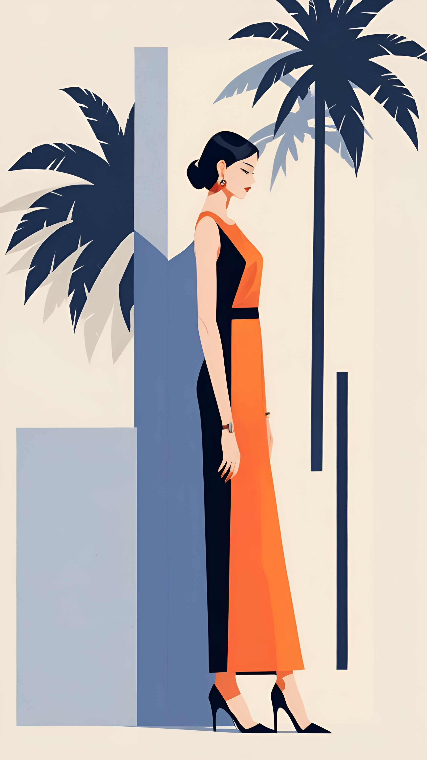 Introducing 'Chic Elegance: A Tropical Fashion Statement,' a striking wallpaper that embodies modern style and sophistication. This artwork features a fashionable woman dressed in a bold, color-blocked gown, elegantly posed against a minimalist backdrop of palm trees and geometric shapes. The combination of vibrant orange and deep black creates a stunning contrast, while the soft pastel background adds a touch of serenity. Perfect for fashion enthusiasts and lovers of contemporary art, this wallpaper invites viewers to embrace their own style and celebrate the beauty of tropical elegance.
