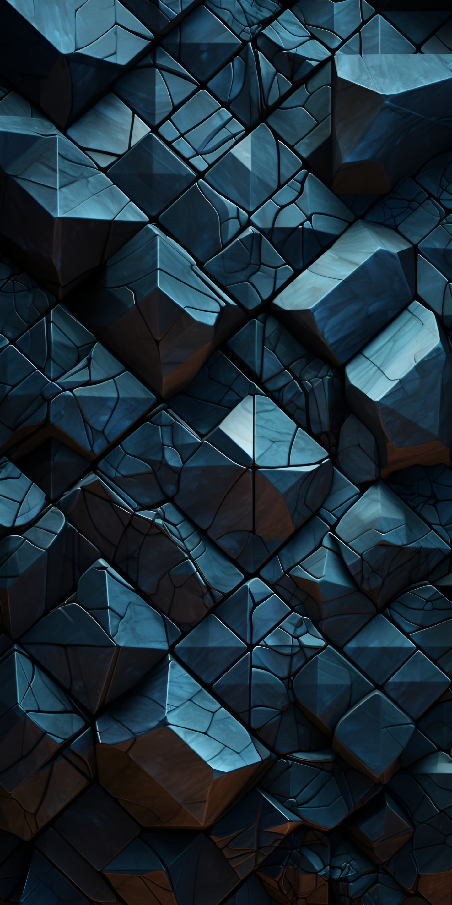 Introducing 'Geometric Depth: The Crystal Facade,' a captivating wallpaper that showcases a stunning arrangement of angular, crystalline shapes in deep blues and blacks. The intricate patterns and sharp edges create a sense of depth and complexity, evoking the beauty of natural rock formations or abstract art. This modern design is perfect for those who appreciate bold aesthetics and geometric precision, making it an ideal choice for both personal and professional digital spaces. Transform your screens with this mesmerizing wallpaper that invites exploration and intrigue.