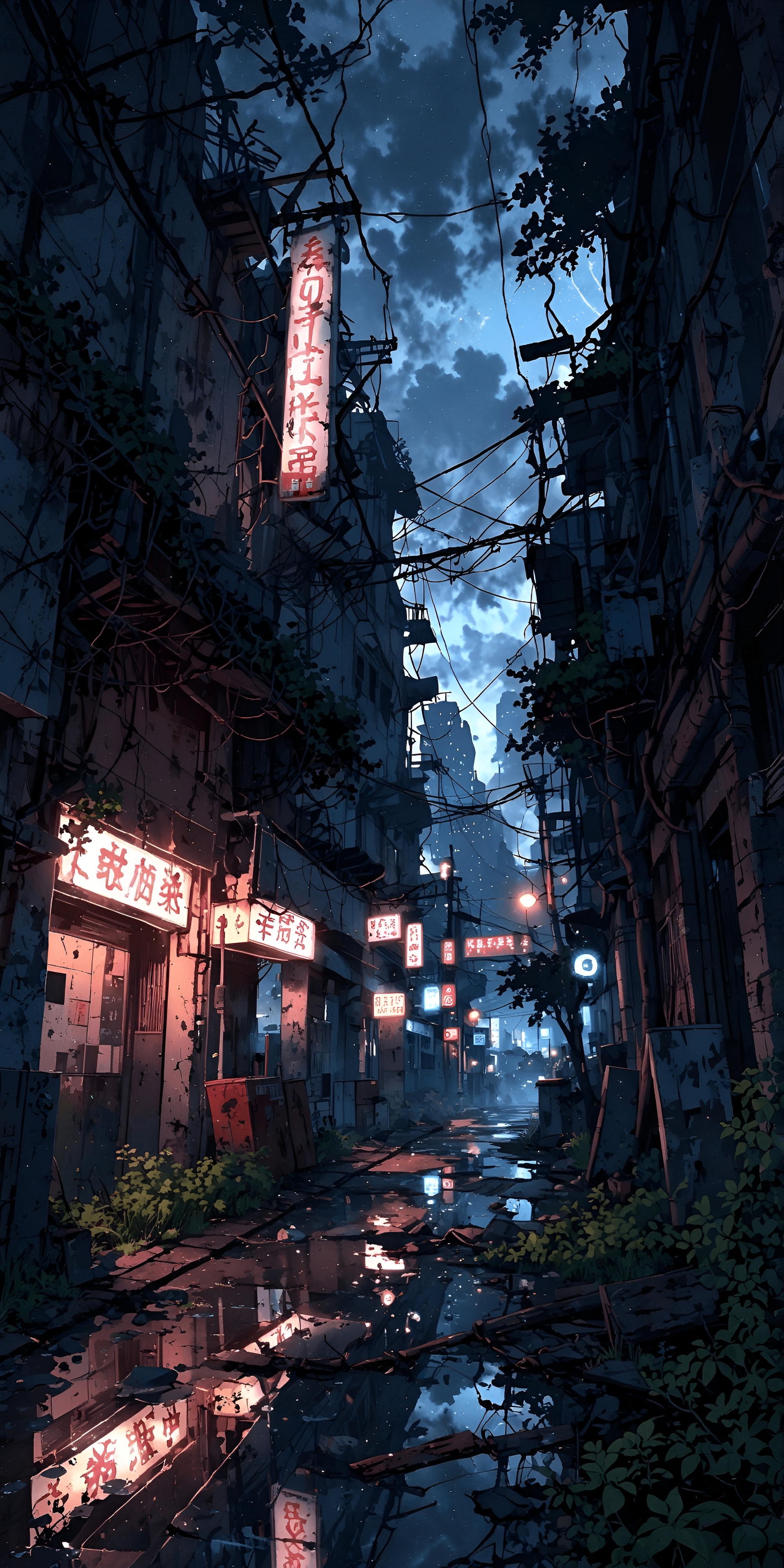 Step into this hauntingly beautiful abandoned alleyway, illuminated by the glow of vintage neon signs. Overgrown vines and debris hint at a once-thriving urban environment now reclaimed by nature. The reflections in the puddles create a surreal atmosphere, while the dark clouds and distant skyscrapers loom ominously above. This artwork captures the juxtaposition of decay and beauty, evoking a sense of nostalgia and intrigue.