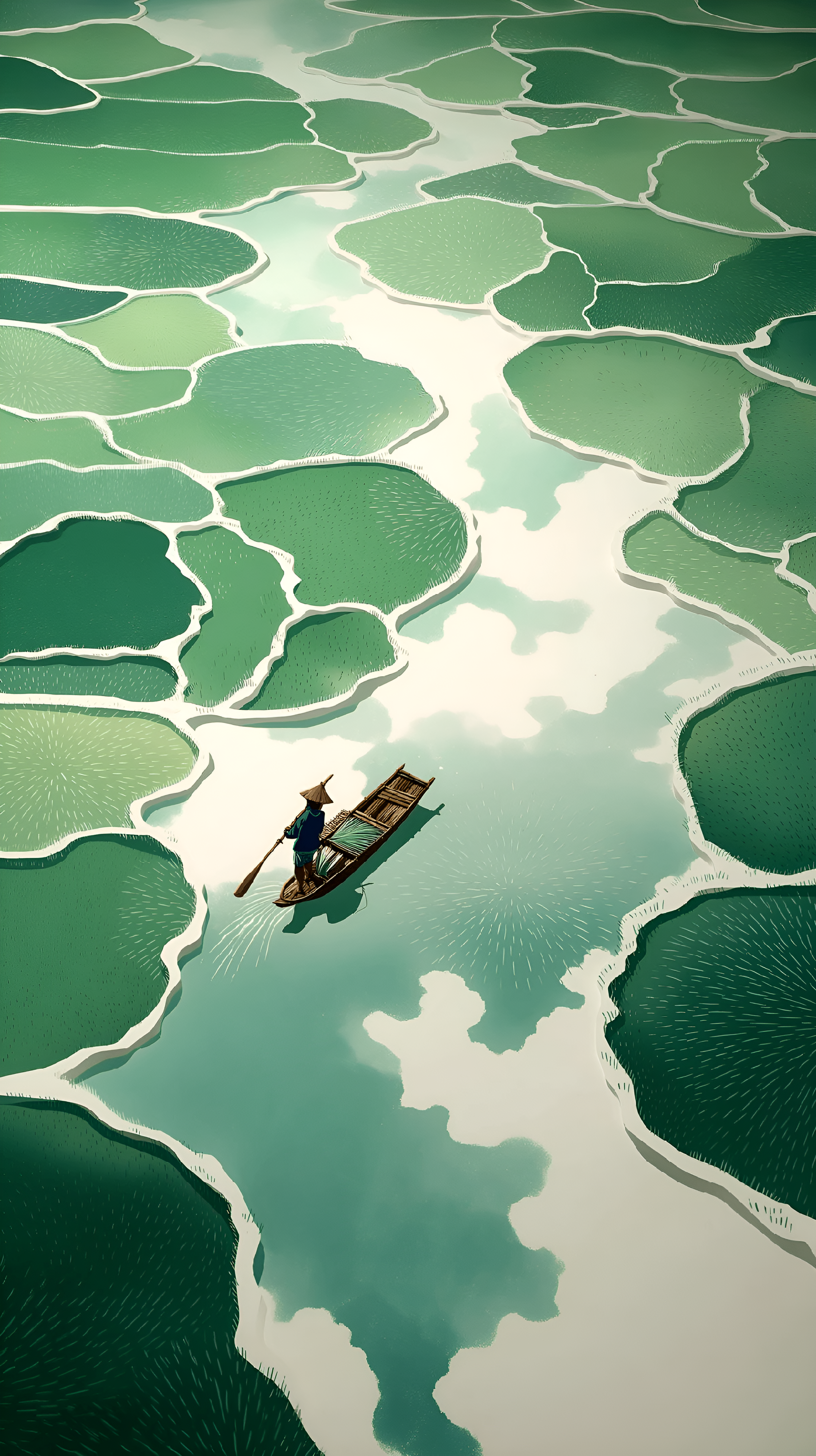 This captivating artwork depicts a serene river journey, where a lone fisherman navigates through a maze of vibrant green lily pads. The gentle curves of the waterway create a harmonious flow, while the soft color palette evokes a sense of peace and tranquility. The scene captures the beauty of nature and the simplicity of life on the water, inviting viewers to reflect on the calming effects of nature.