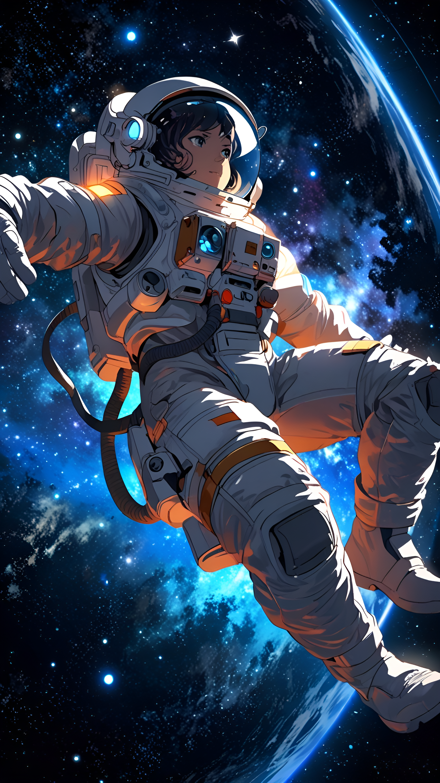 Dreaming among the stars! This anime-style astronaut floats serenely above Earth, surrounded by a cosmic ocean of vibrant blues and sparkling galaxies. Perfect for space lovers!