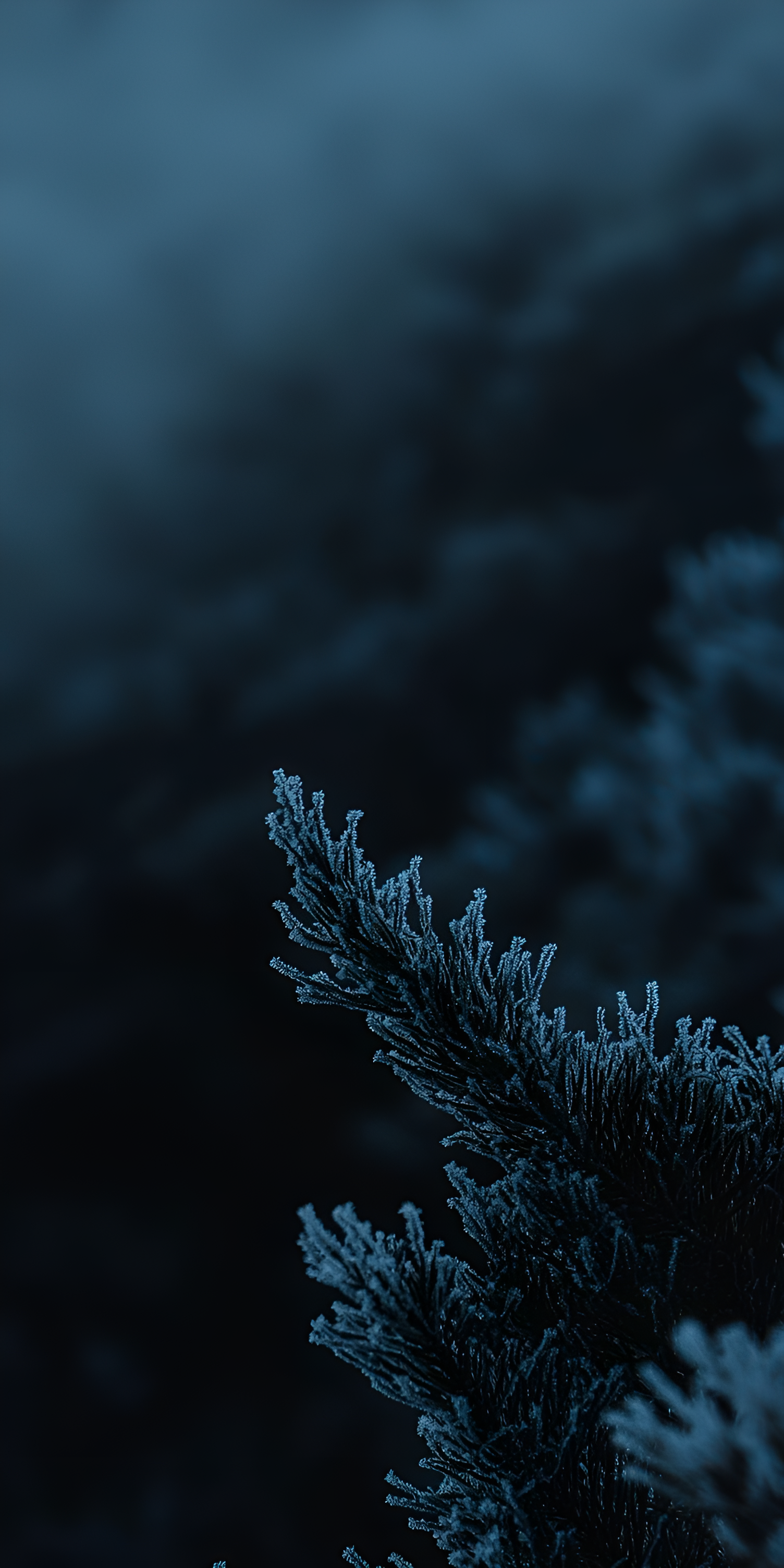 Capture the stillness of winter with this frosted pine branch against a deep blue background. Evokes feelings of peace, quiet reflection, and the beauty of nature's icy touch.