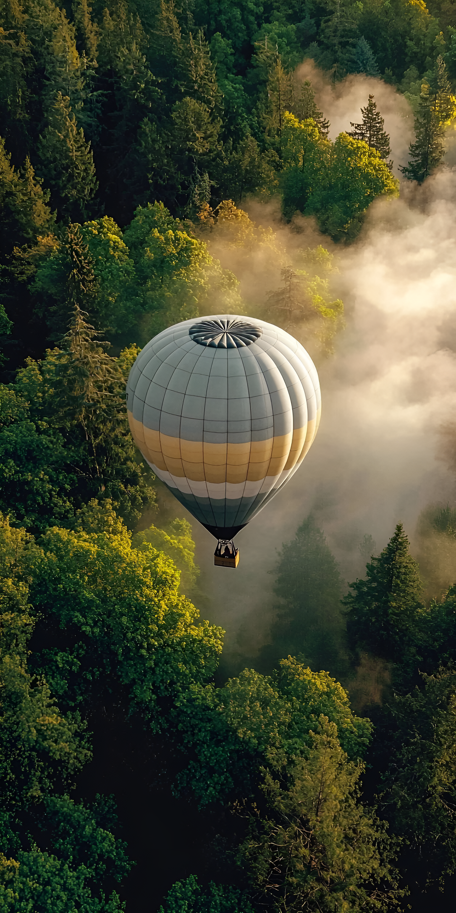 Float away with this captivating wallpaper. A lone hot air balloon drifts over a misty forest canopy, bathed in soft, golden light. Perfect for adding a touch of adventure and tranquility to your screen.