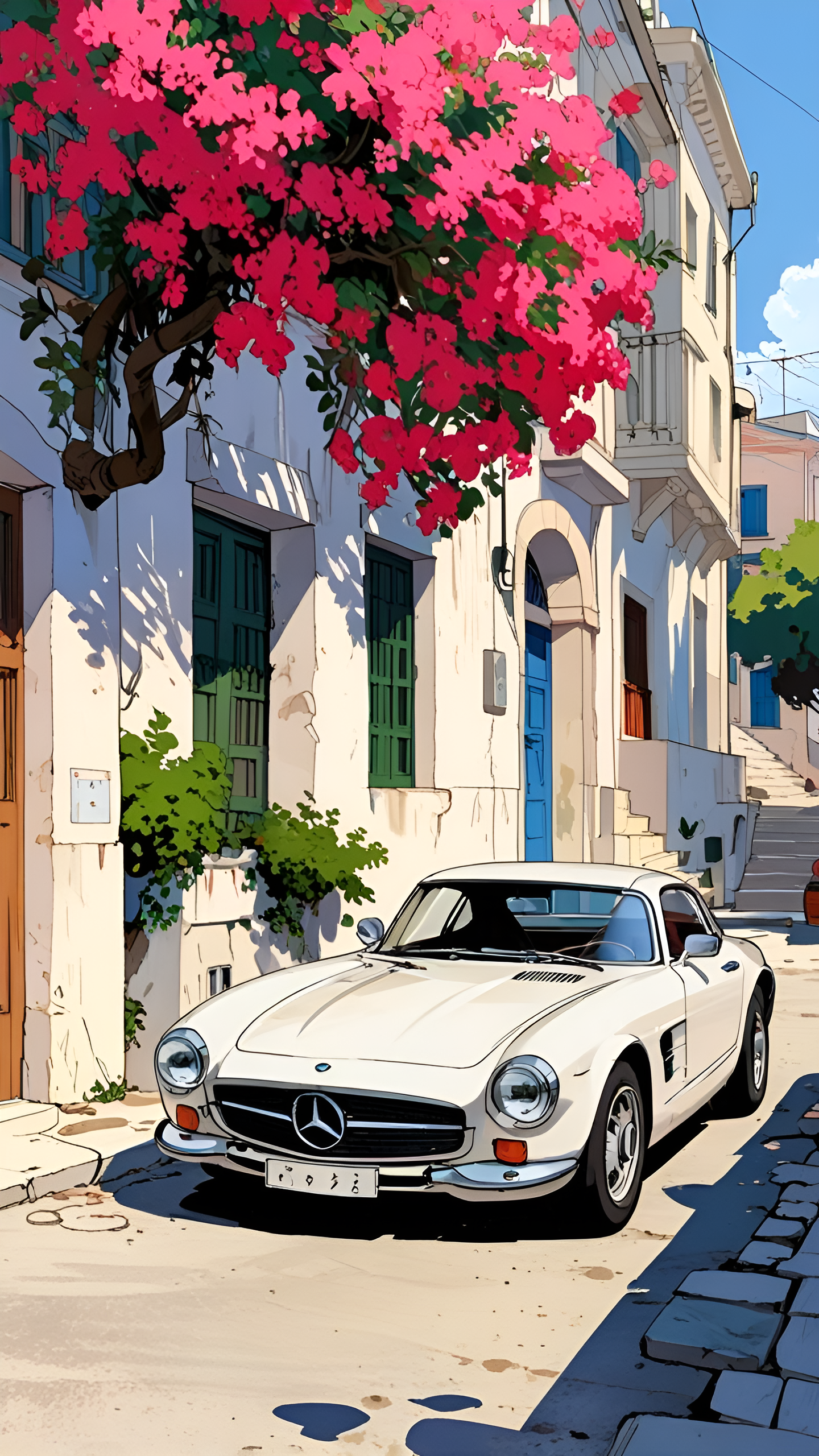 Escape to a sun-kissed street where a classic Mercedes rests under vibrant blossoms. This captivating wallpaper blends automotive elegance with the serene beauty of a charming coastal setting. Bring a touch of wanderlust to your screen.