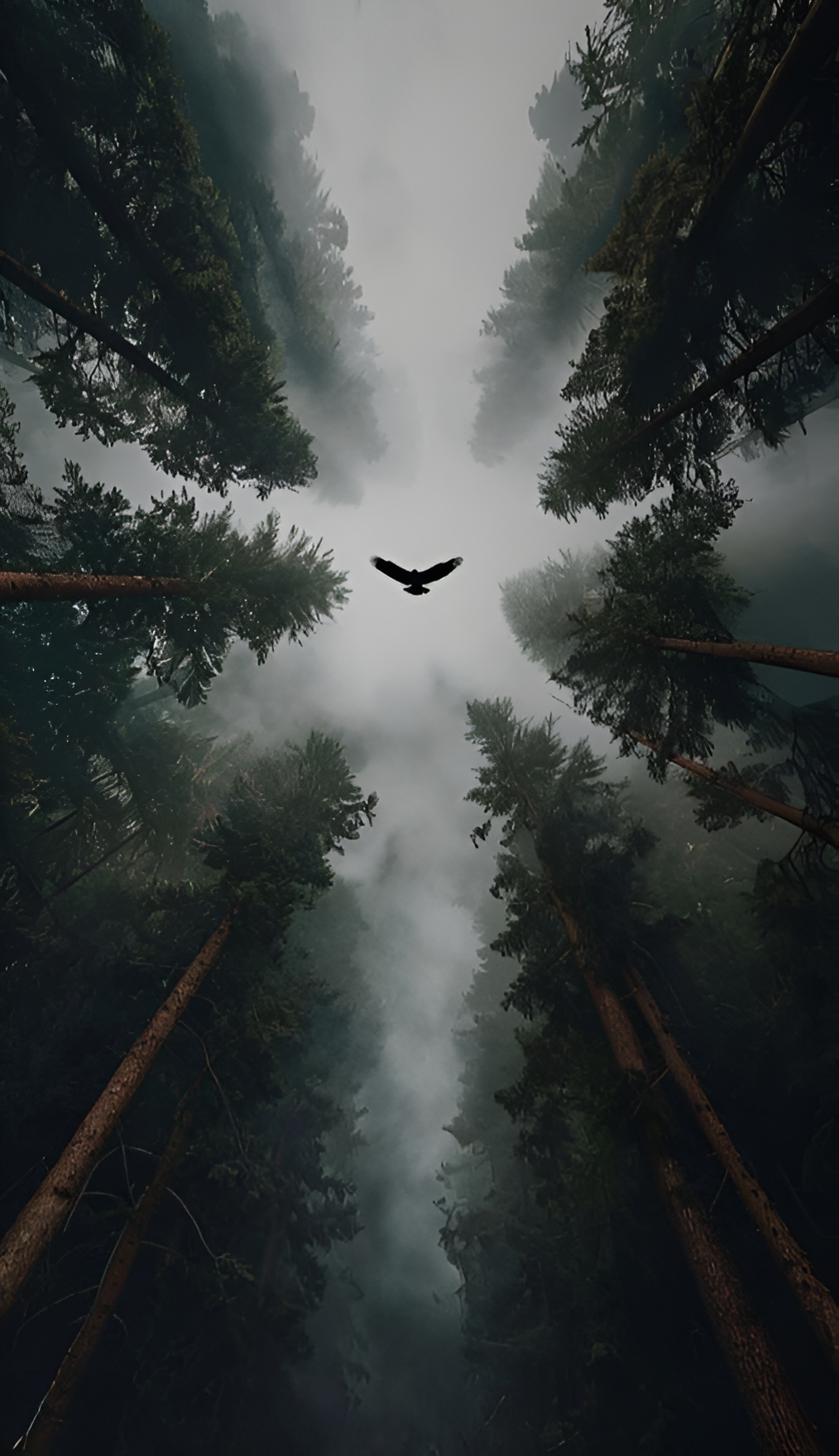 Find peace and serenity with this view of an eagle soaring above a misty forest. The tall trees and fog create a moody, atmospheric scene, perfect for adding depth to your screen.