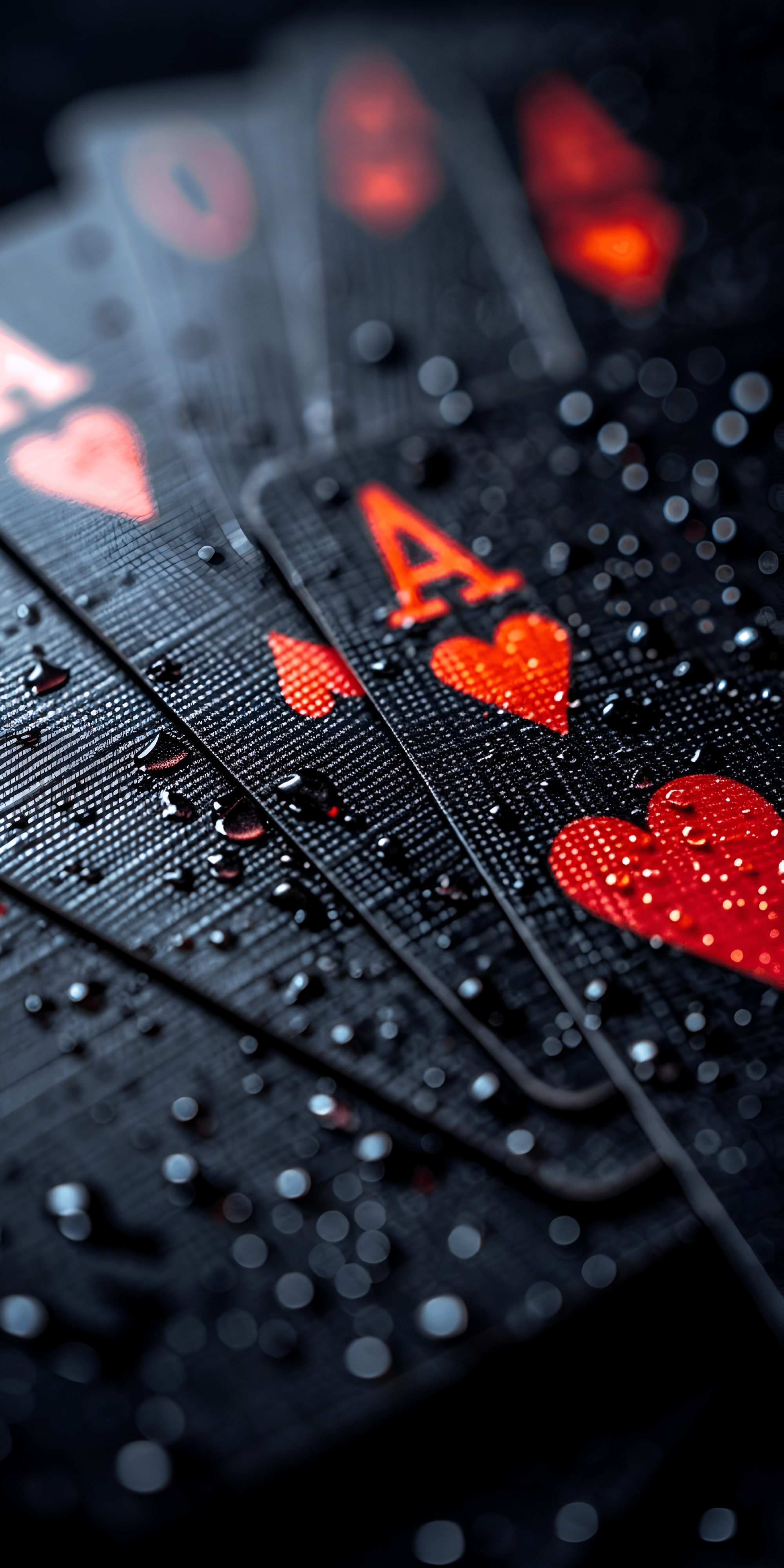 Intense close-up of playing cards, focusing on the Ace of Hearts, covered in water droplets. A dramatic and moody backdrop, perfect for adding an element of suspense and intrigue.