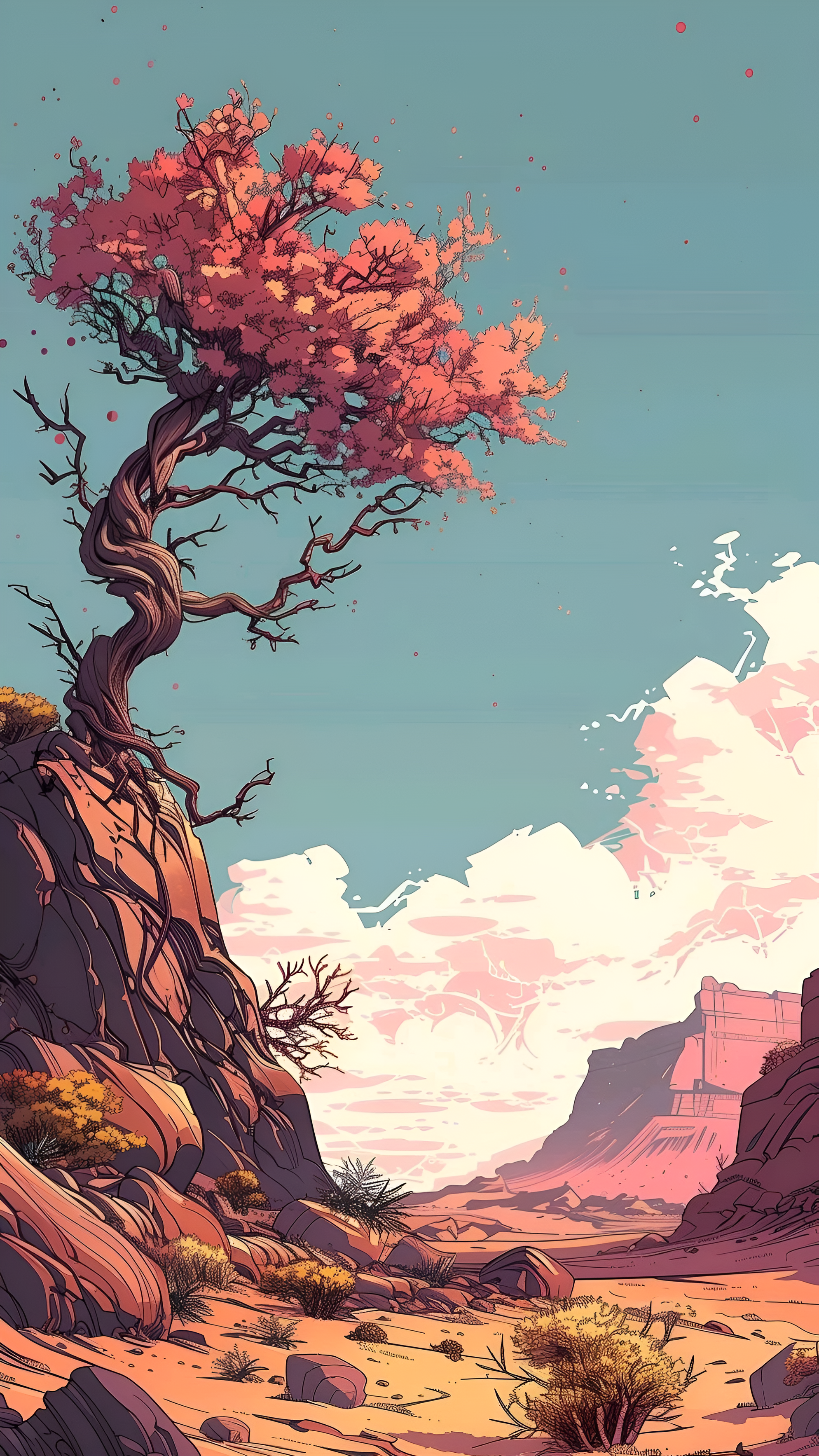 Drift into a serene desert landscape featuring a vibrant, blossoming tree against a backdrop of gentle skies and softly colored canyons. A calming and unique addition to your digital space.