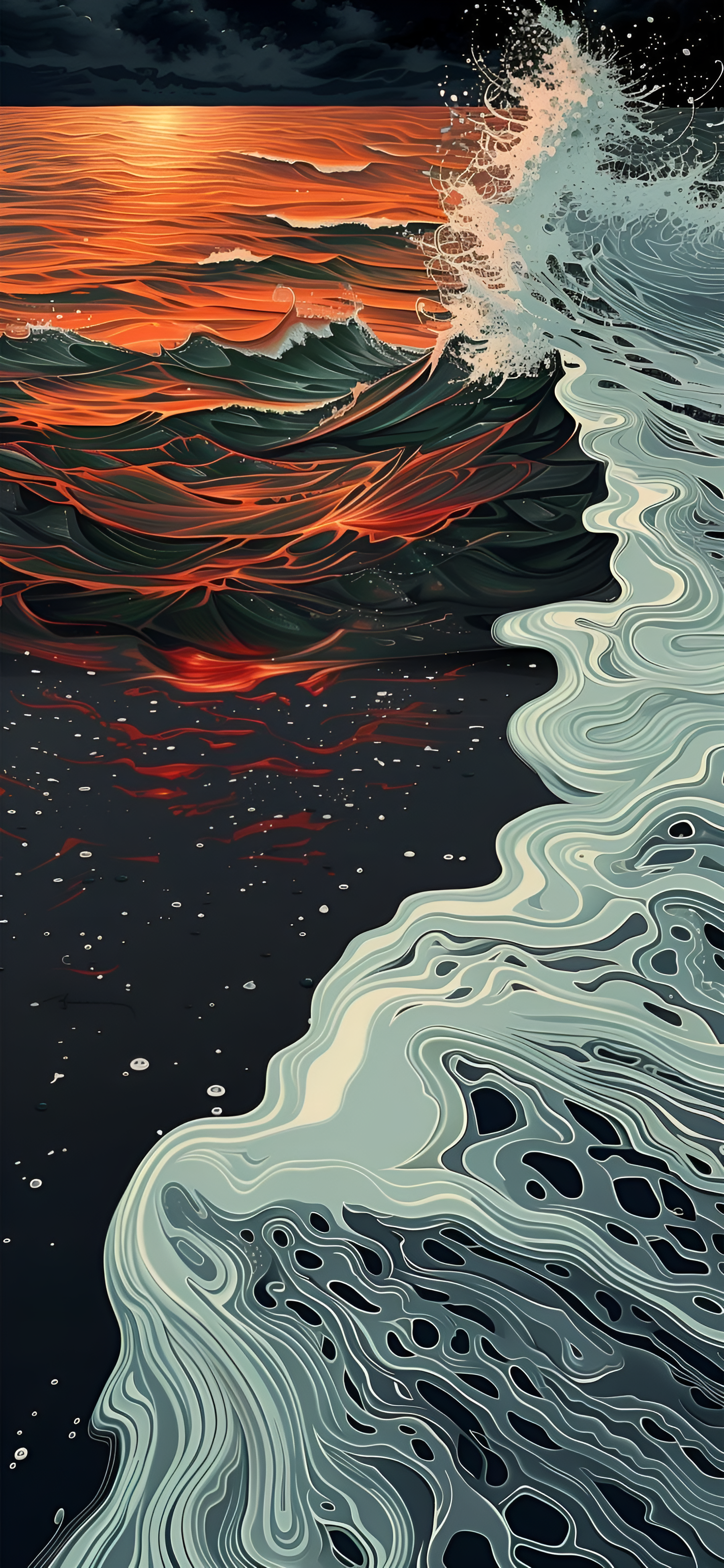 Experience the drama of a sunset-kissed ocean. Bold waves contrast fiery colors against cool, abstract currents in this striking wallpaper. Bring dynamic energy to your screen.