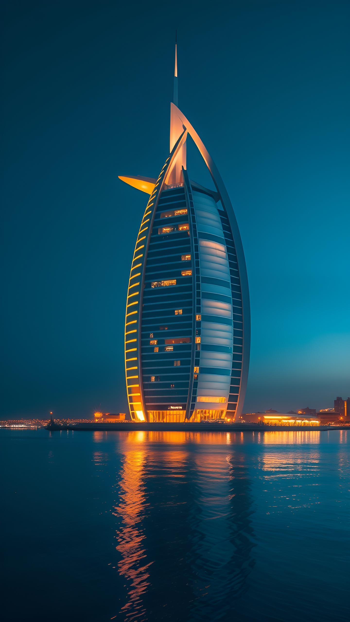 Gaze upon the majestic Burj Al Arab in Dubai, illuminated against the twilight sky. Its reflection shimmers on the calm waters, creating a serene and captivating wallpaper experience.