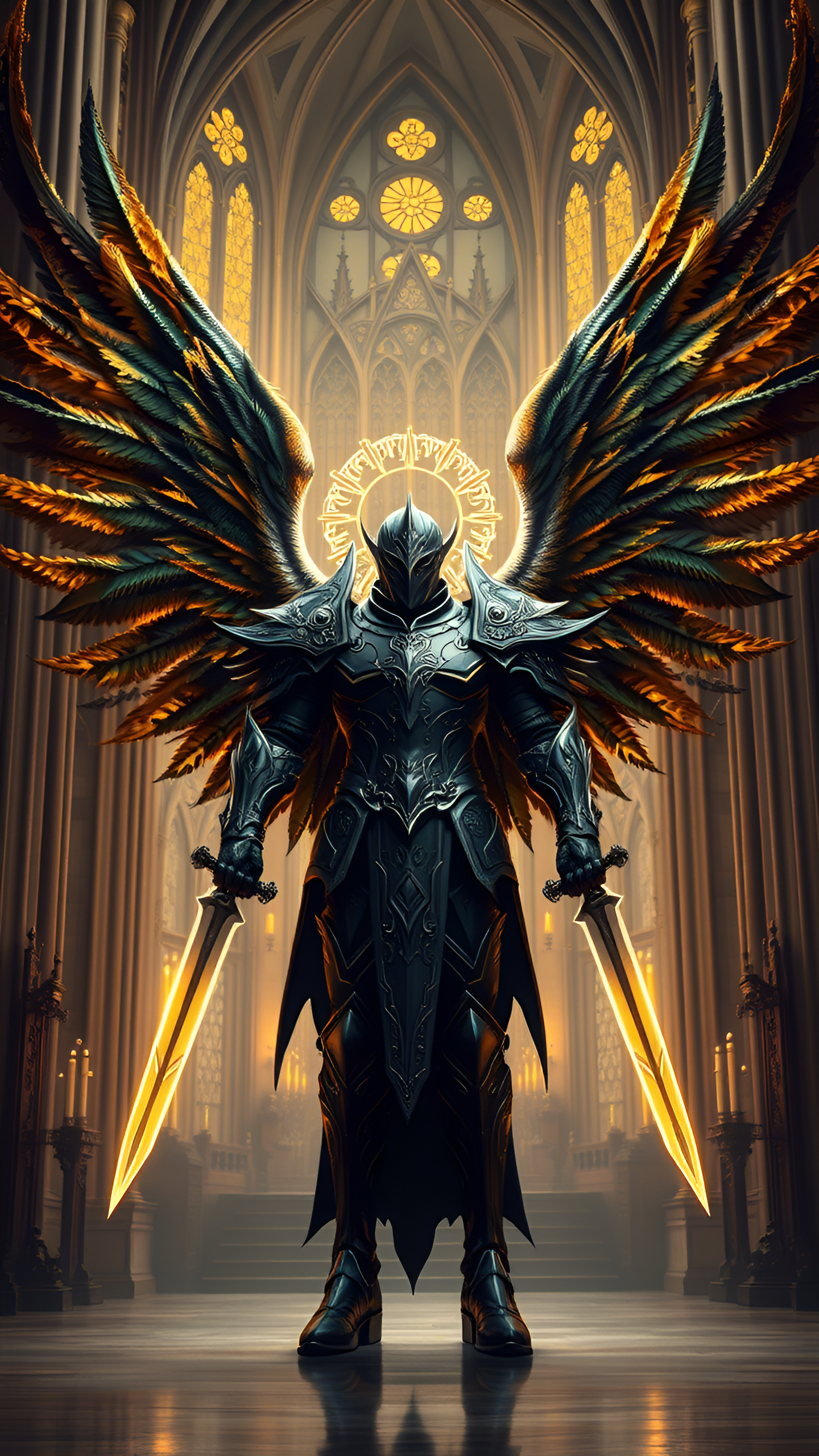 A powerful armored angel with feathered wings stands guard inside a grand gothic cathedral. The soft, golden light creates a sense of divine protection and unwavering strength, perfect for fantasy enthusiasts.