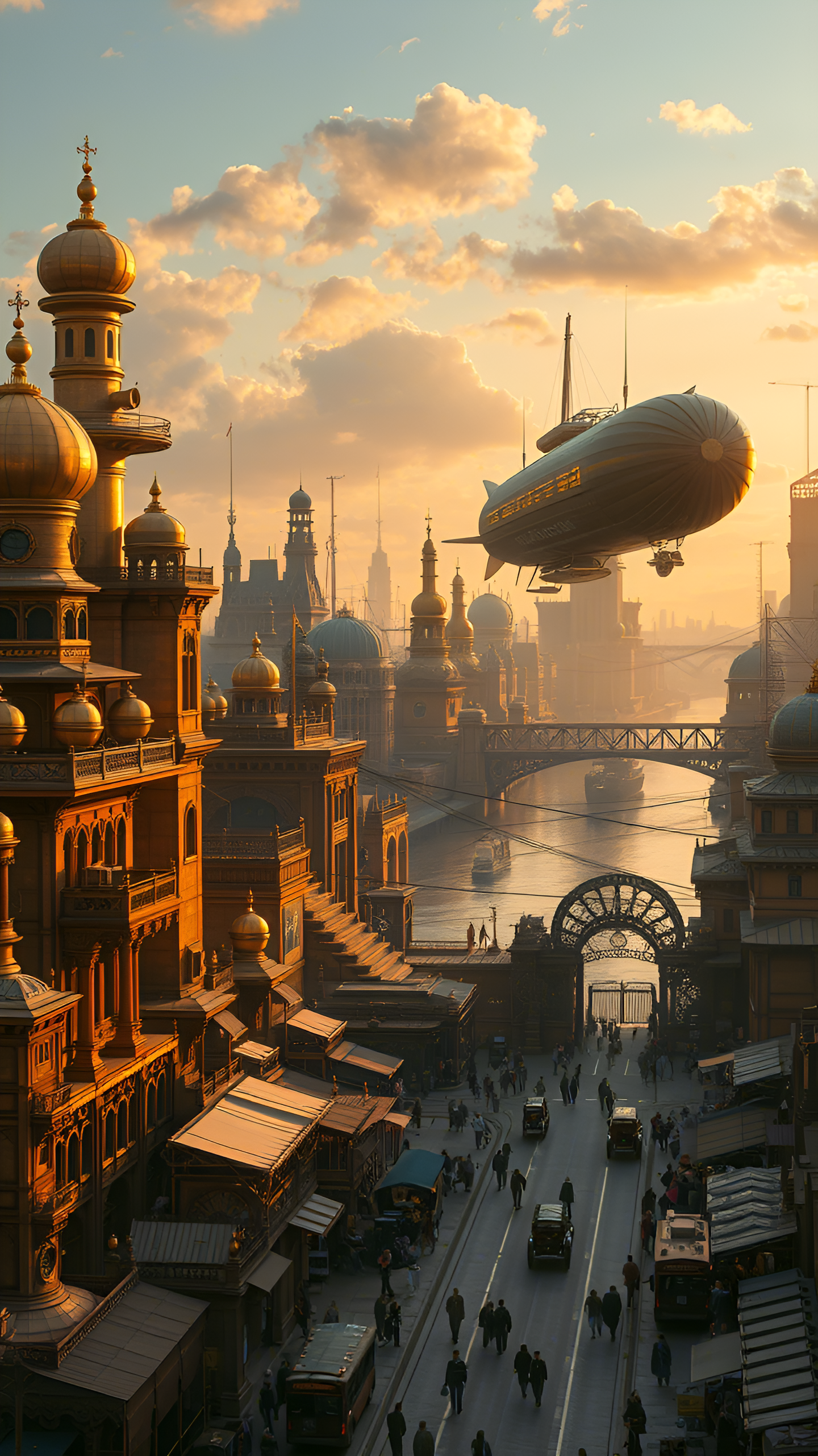 Journey to a golden-hued steampunk city. Behold majestic architecture and soaring airships in this fantastical cityscape. Let your imagination take flight!