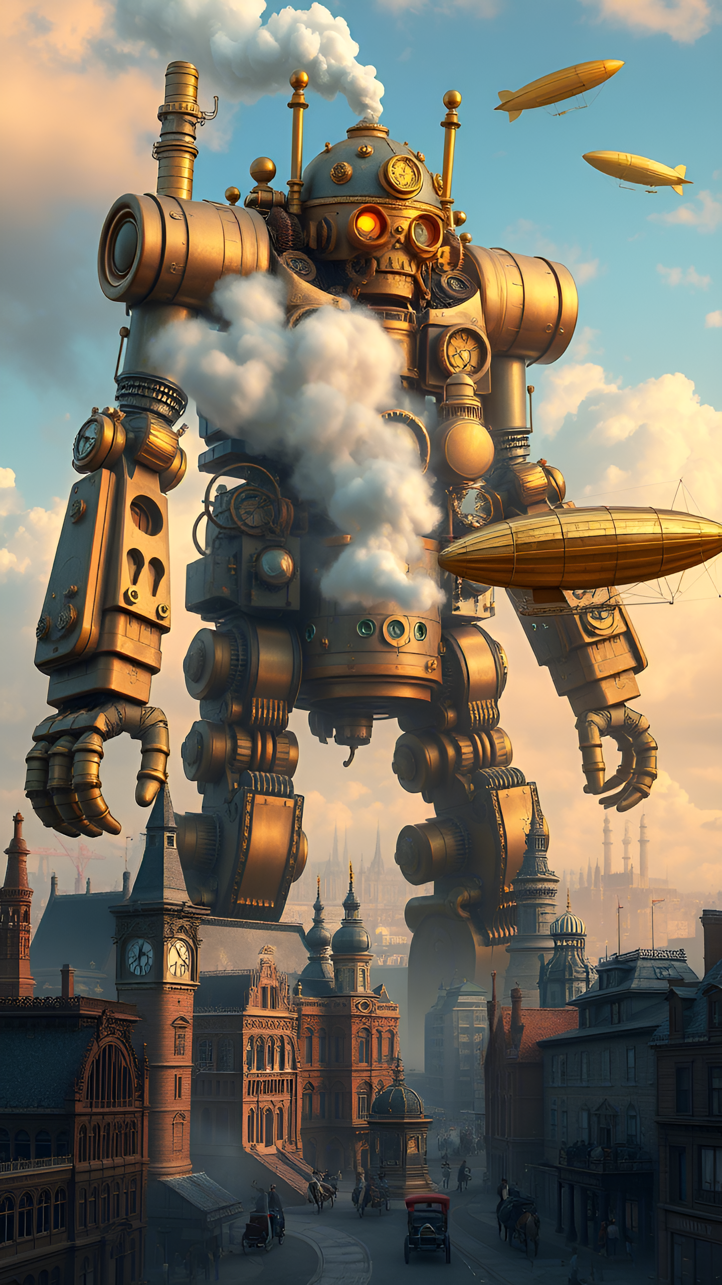 A towering steampunk robot dominates a vintage cityscape with golden airships floating nearby. Evokes a sense of grand adventure and retro-futuristic fantasy. Perfect for steampunk enthusiasts and dreamers.