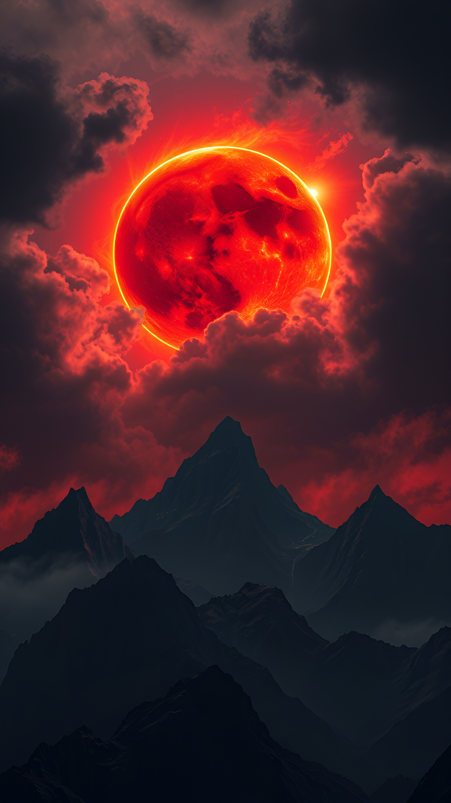 Witness the power of a crimson eclipse looming over majestic, dark mountains. This dramatic landscape evokes a sense of awe and the raw beauty of nature's celestial events. Perfect for a bold and unique wallpaper.