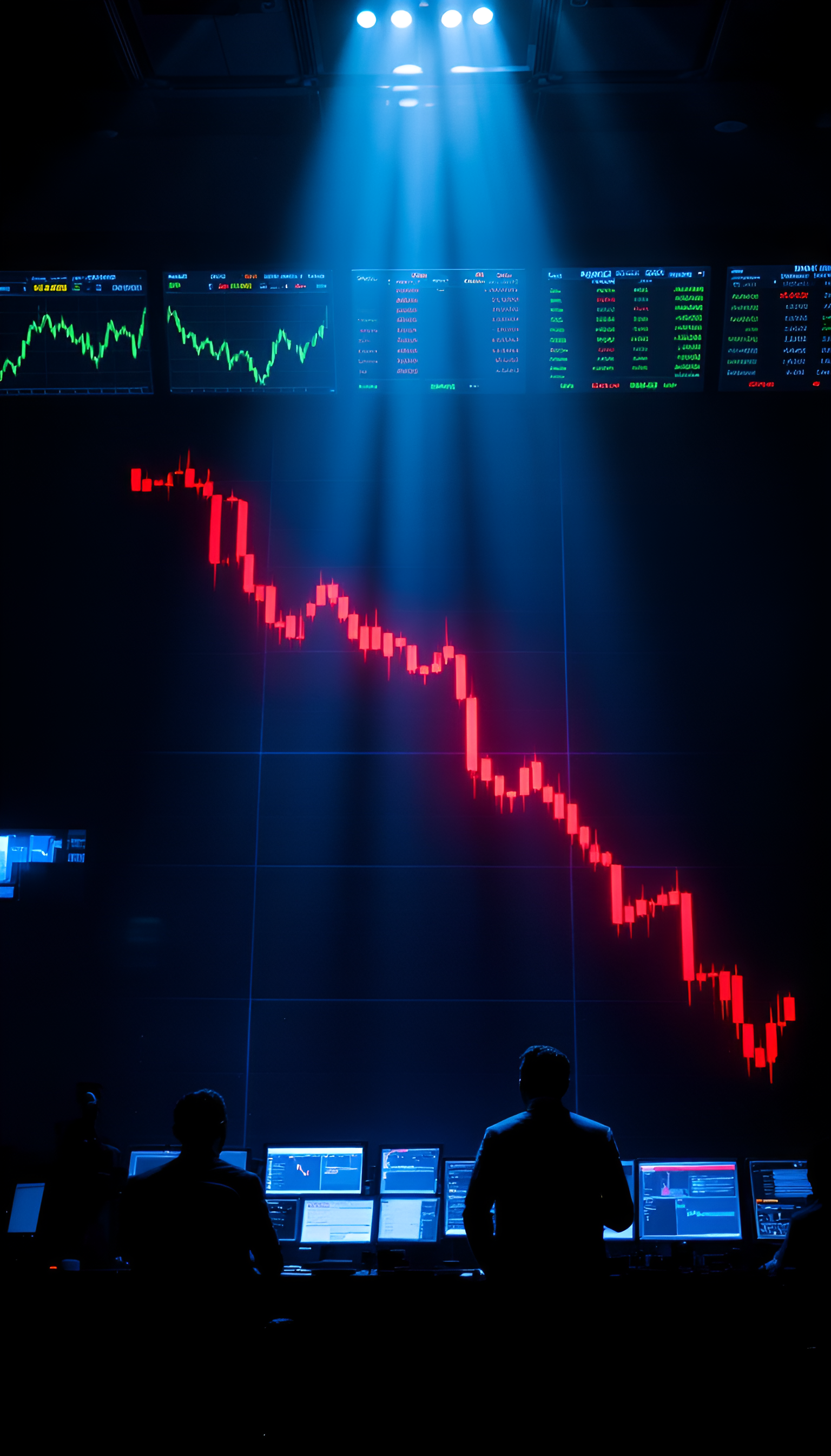 A dramatic view of a stock market downturn with a sharply declining red chart under intense blue lighting. Silhouetted figures in a control room observe the financial crisis unfolding on their screens, conveying high stakes.