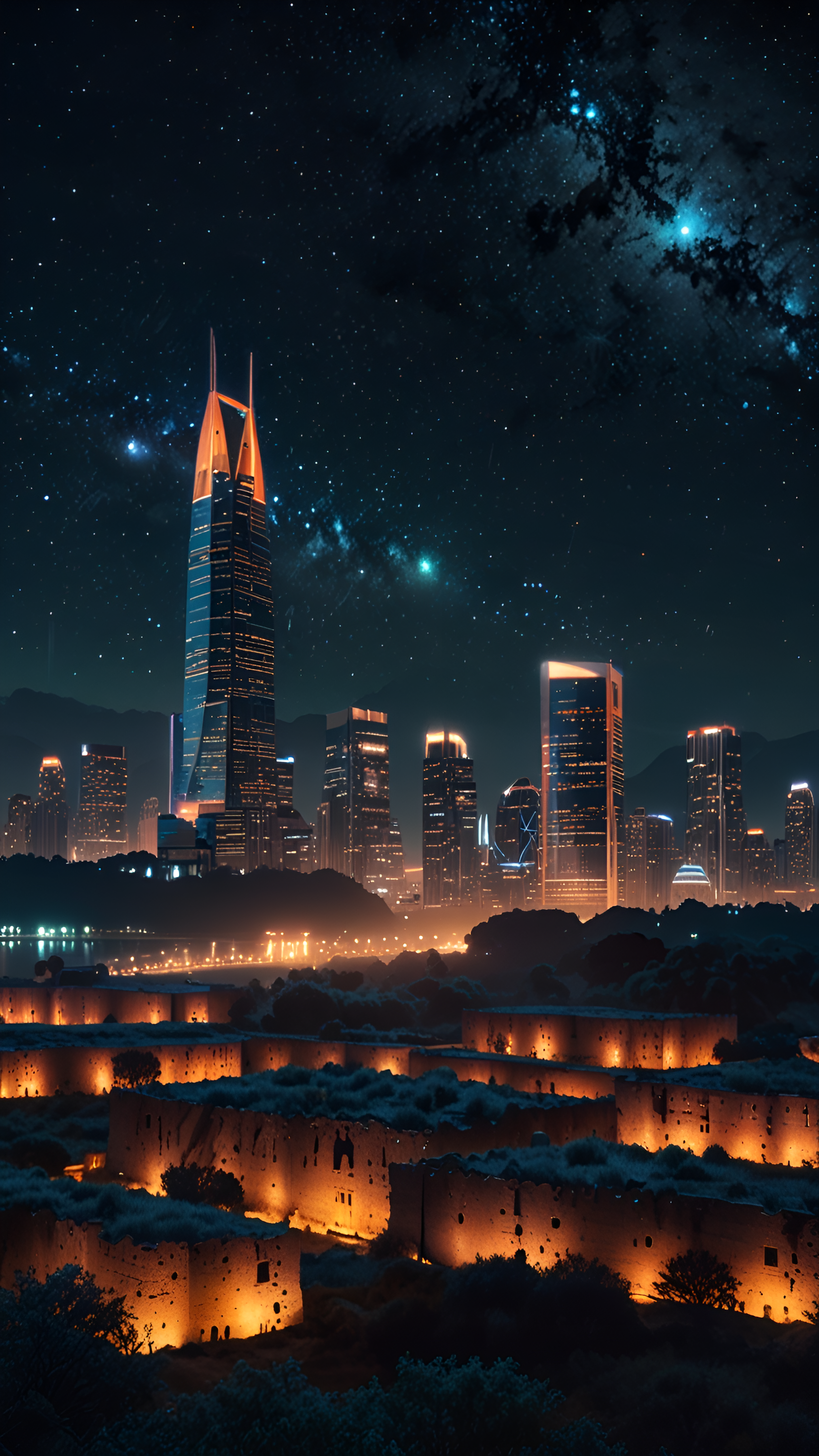 Experience the magic of twilight with this cityscape wallpaper, where the city lights blend seamlessly with a breathtaking starlit sky. A vibrant and inspiring backdrop for your device.