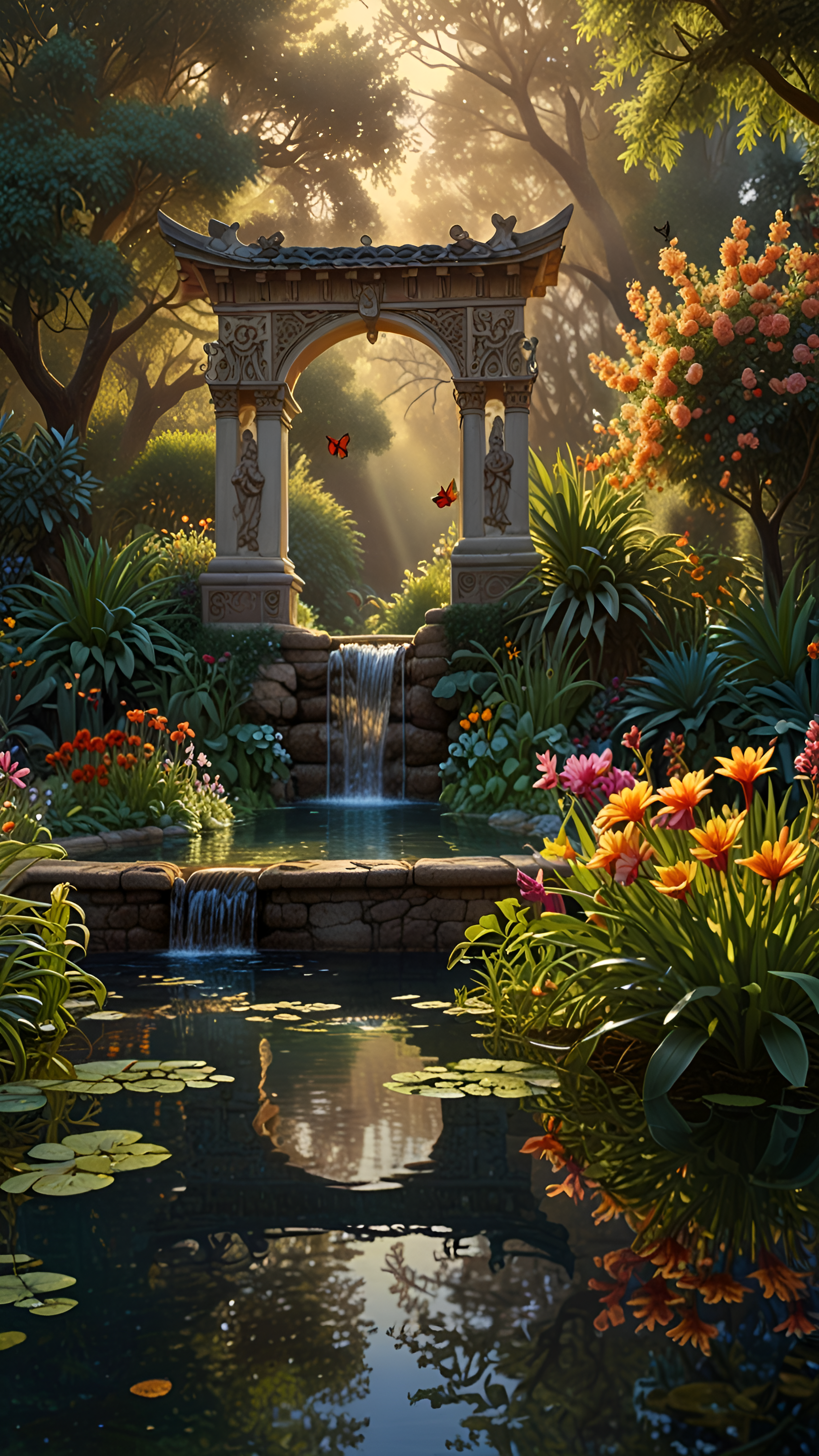Escape to a tranquil paradise with this dreamy garden scene. A stone archway frames a gentle waterfall cascading into a peaceful pond, surrounded by vibrant flowers and lush greenery. Find your inner peace.
