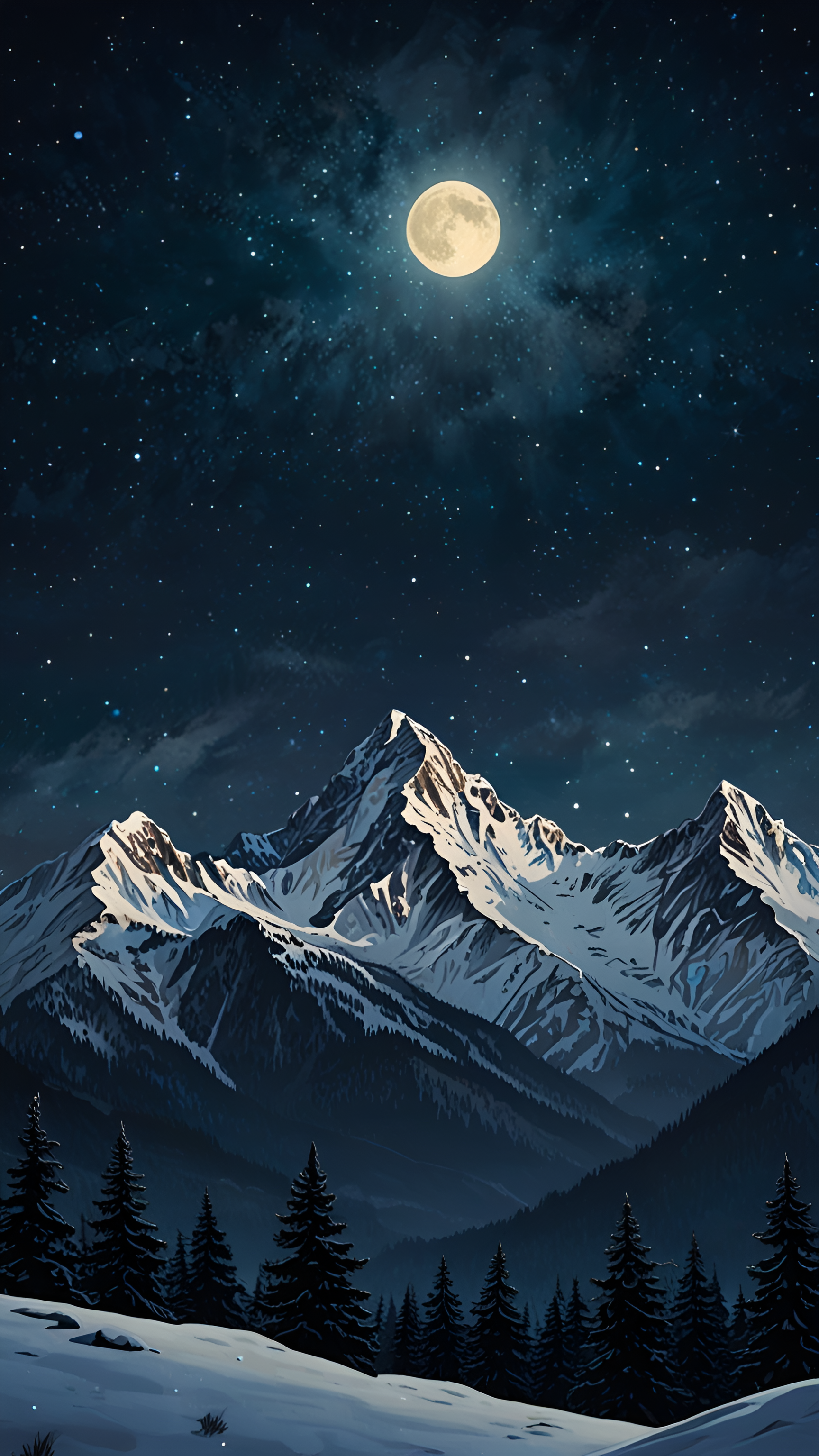 Embrace the serene beauty of a snow-capped mountain range under a luminous full moon. A starry night sky enhances the majestic view, offering tranquility and a sense of wonder.