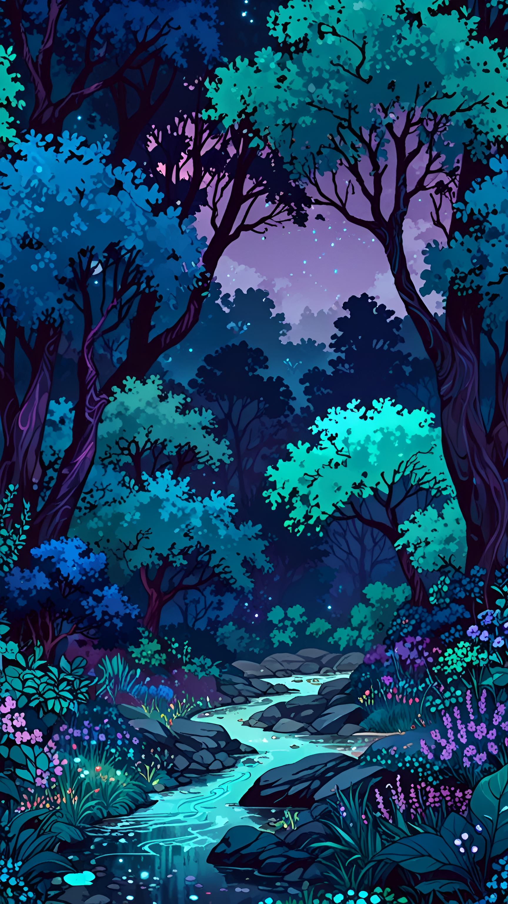Escape into an enchanted forest. This vibrant wallpaper features a gentle stream winding through a lush, colorful landscape under a starry night sky. Perfect for adding a touch of magic to your device.