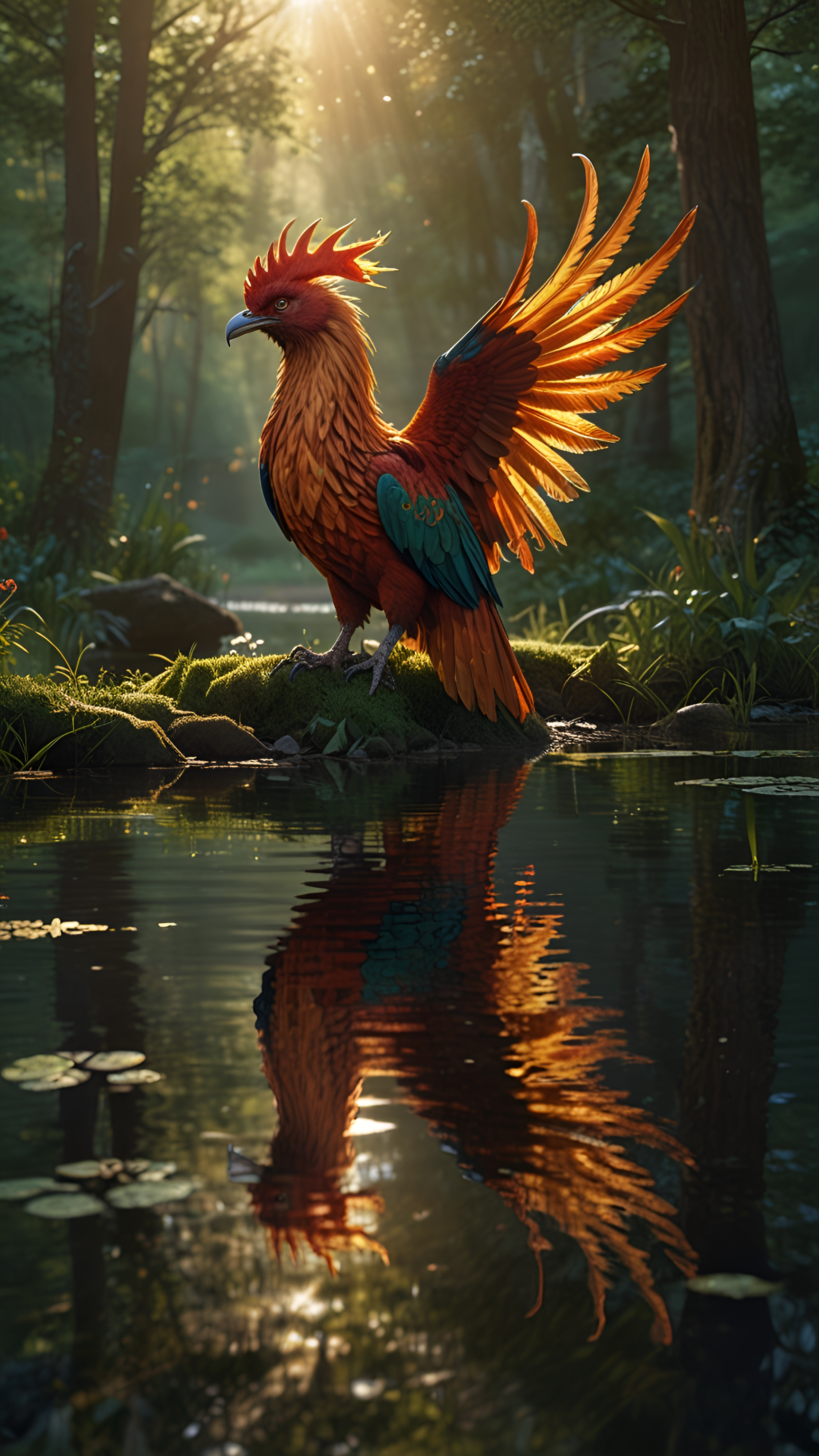 A vibrant rooster, bathed in golden sunlight, stands serenely beside a calm pond. Its fiery plumage is reflected in the water, creating a captivating image of nature's beauty and tranquility.